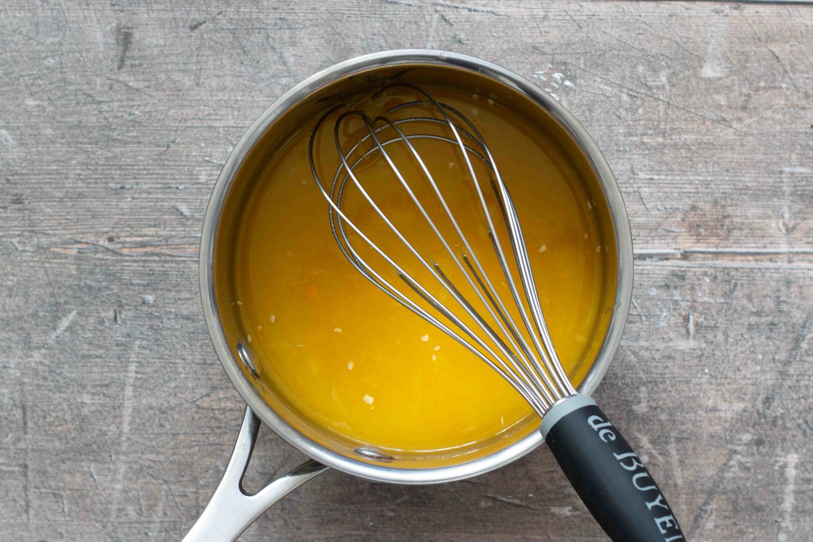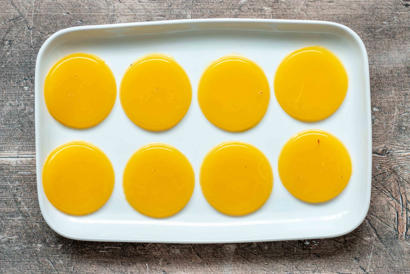 - Fouettez le jus d’orange, les zestes, les 2g d’agar agar dans une casserole et faire bouillir. Dès les premières ébullitions fouettez sans cesse le mélange et au moins pendant 2 minutes. Versez ensuite dans les empreintes. Le mélange va se gélifier en refroidissant. Vous pouvez accélérer le process en plaçant au frais.