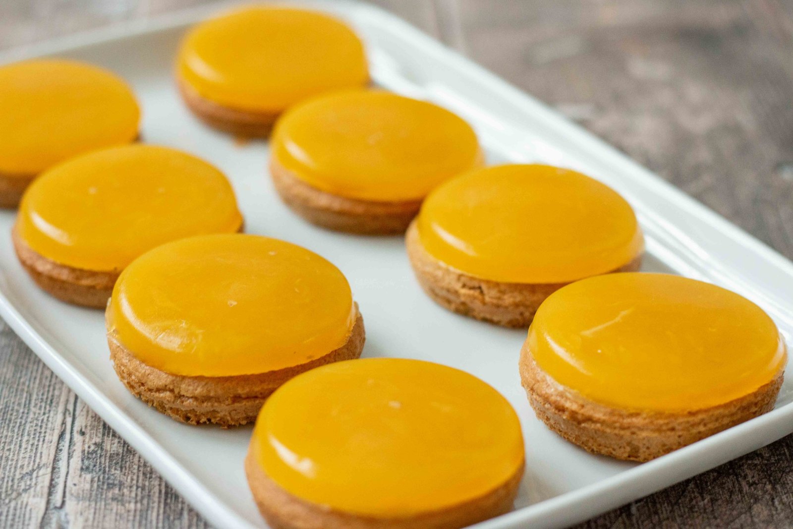 - Une fois bien gélifiés, placez les disques sur les génoises et placez les au congélateur pendant 1H. L’objectif est de lier la génoise et la gelée pour faciliter l’étape de la coque en chocolat.
