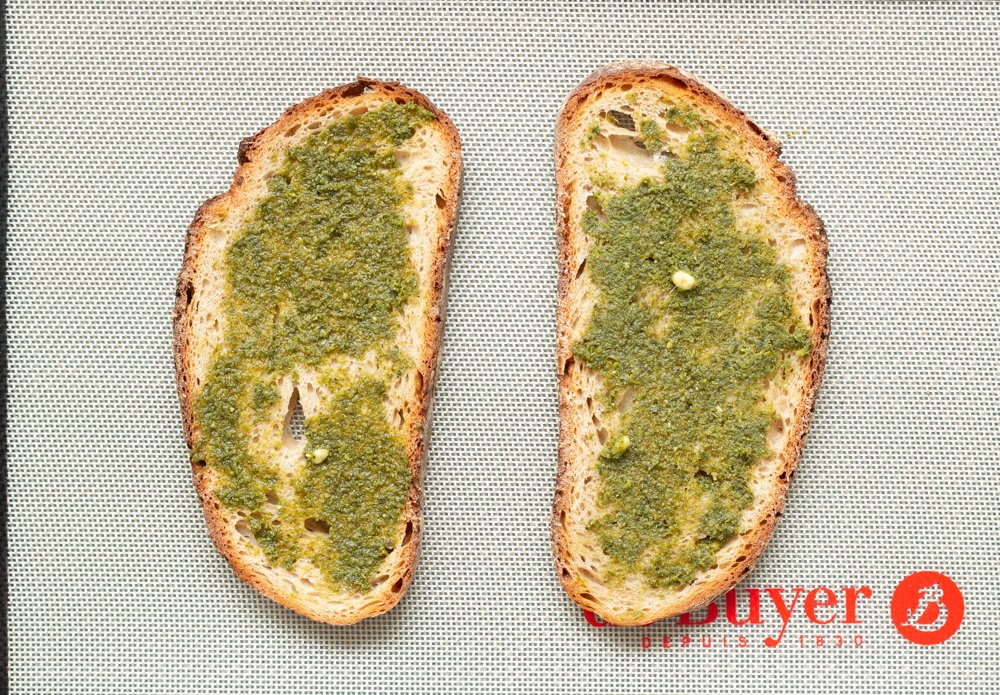 - A la sortie du four, tartinez vos tartines de pesto à l’aide d’une cuillère à café. N’éteignez pas votre four et montez la température à 200°.