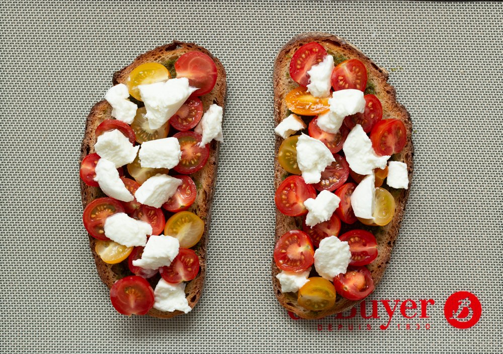 Bruschetta au pesto, tomates cerises et mozzarella