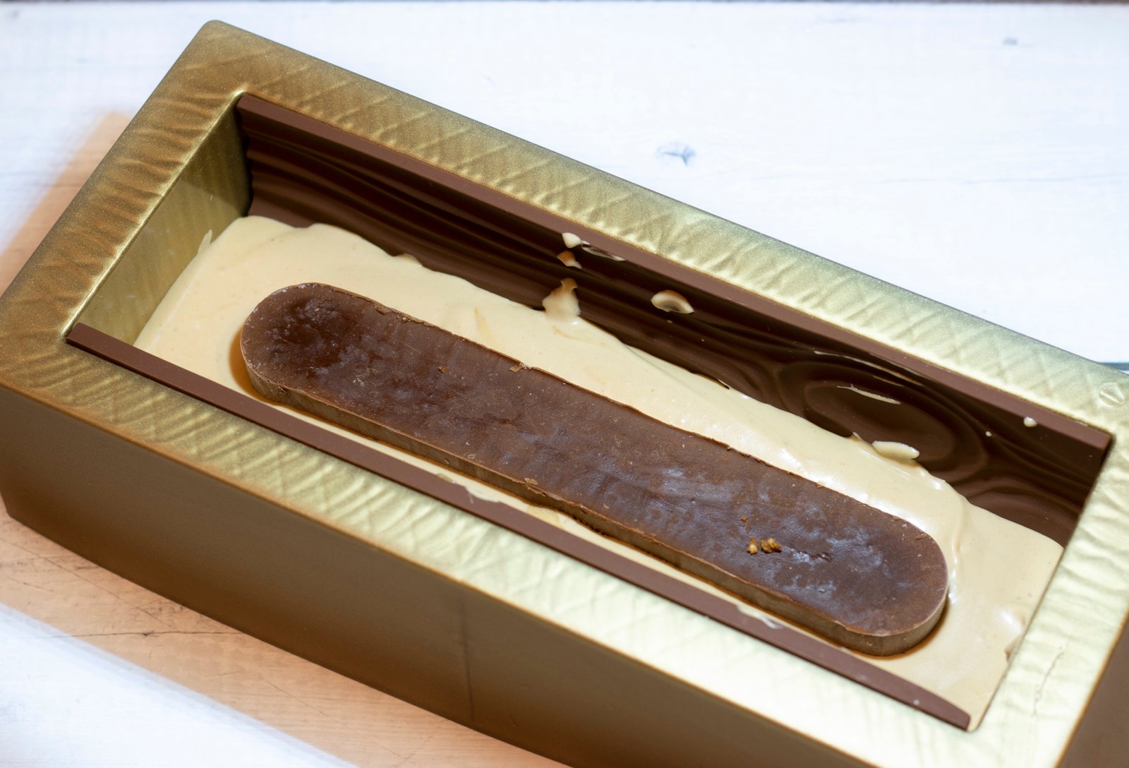 - Versez la moitié de la crème pralinée dans votre moule puis ajoutez l’insert chocolat. Recouvrez du reste de crème puis posez votre base croustillante en pressant délicatement dans la crème pour que celle ci remonte sur les côtés et que l’ensemble arrive au ras du moule.