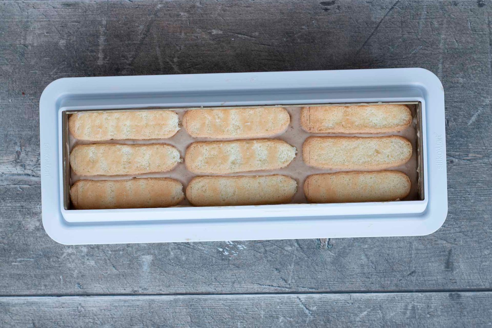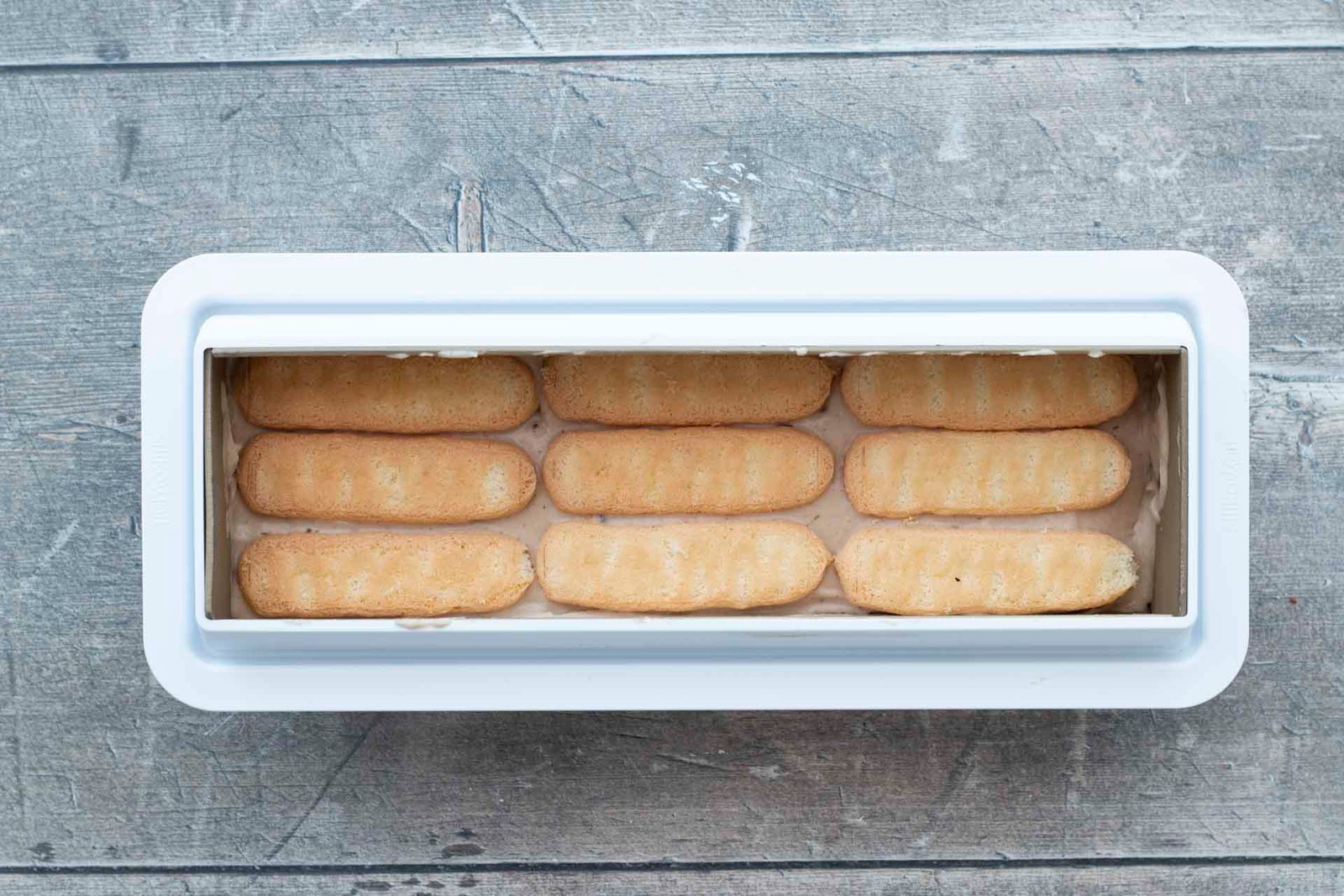- Versez la moitié de la mousse dans votre moule à bûche. Insérez une première couche de biscuits cuillère. Déposez le restant de mousse puis recouvrez d’une dernière couche de biscuits cuillère.