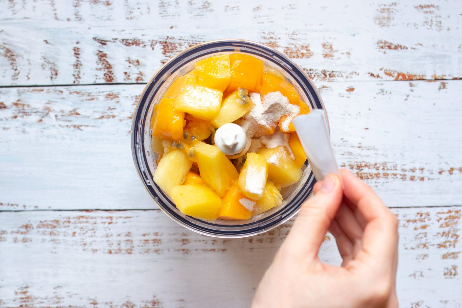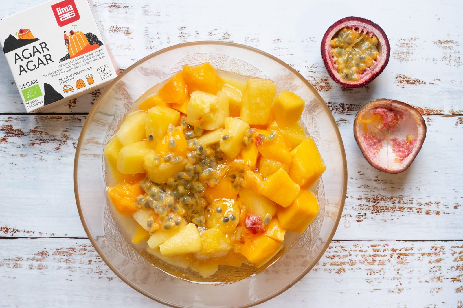 - Dans un premier temps décongelez 500 g de fruits congelés (mélange d’ananas et mangue). Une fois décongelés, mixez au petit robot les fruits ainsi que les 2 fruits de la passion et le jus de citron avec 4 cuillères à soupe de sirop d’agave et 4 g d’agar agar . Mixez jusqu’à obtenir une purée de fruits.