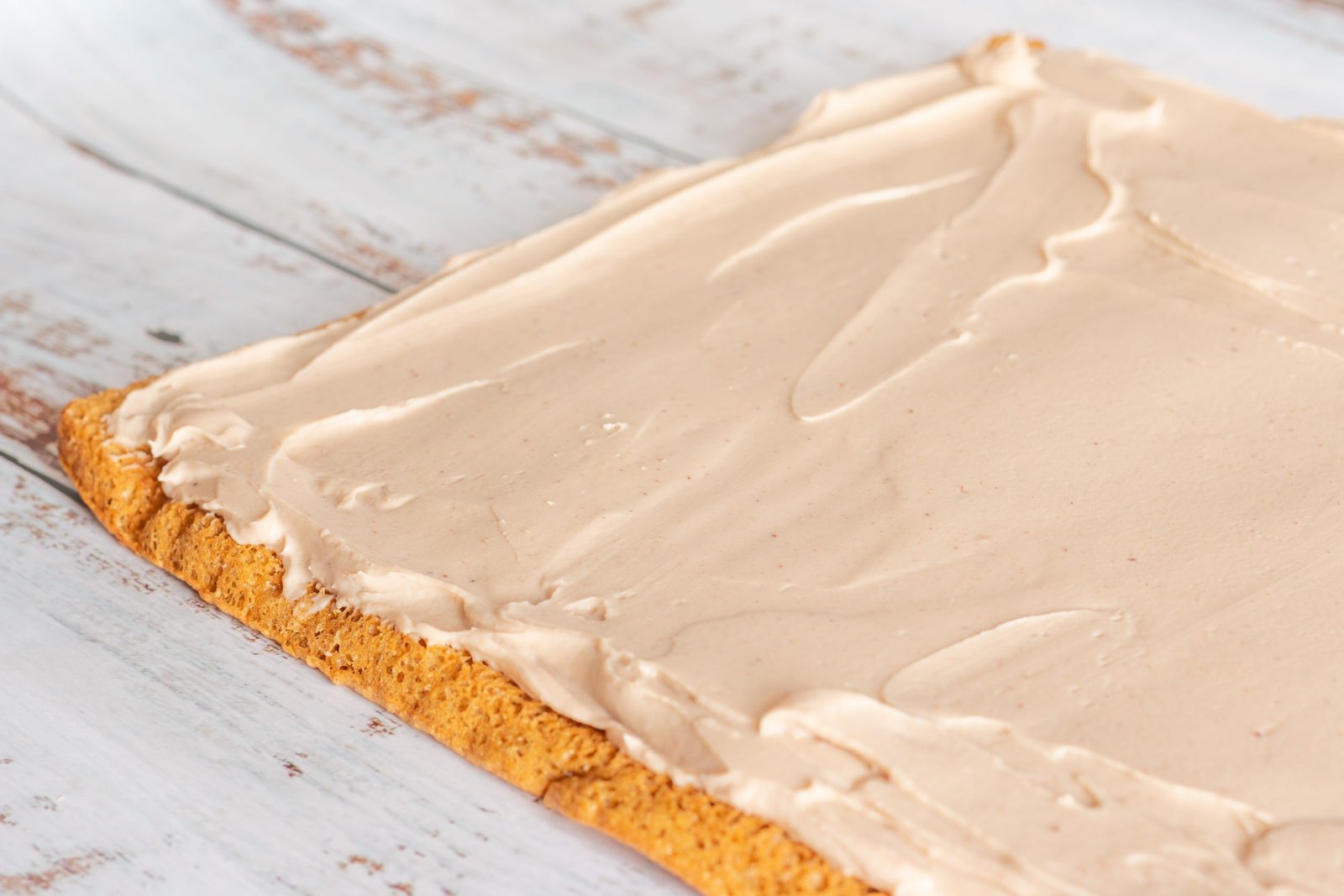 - Une fois votre génoise refroidie, déroulez-la et garnir de crème de marrons/mascarpone. Étalez uniformément en vous aidant d’une spatule.