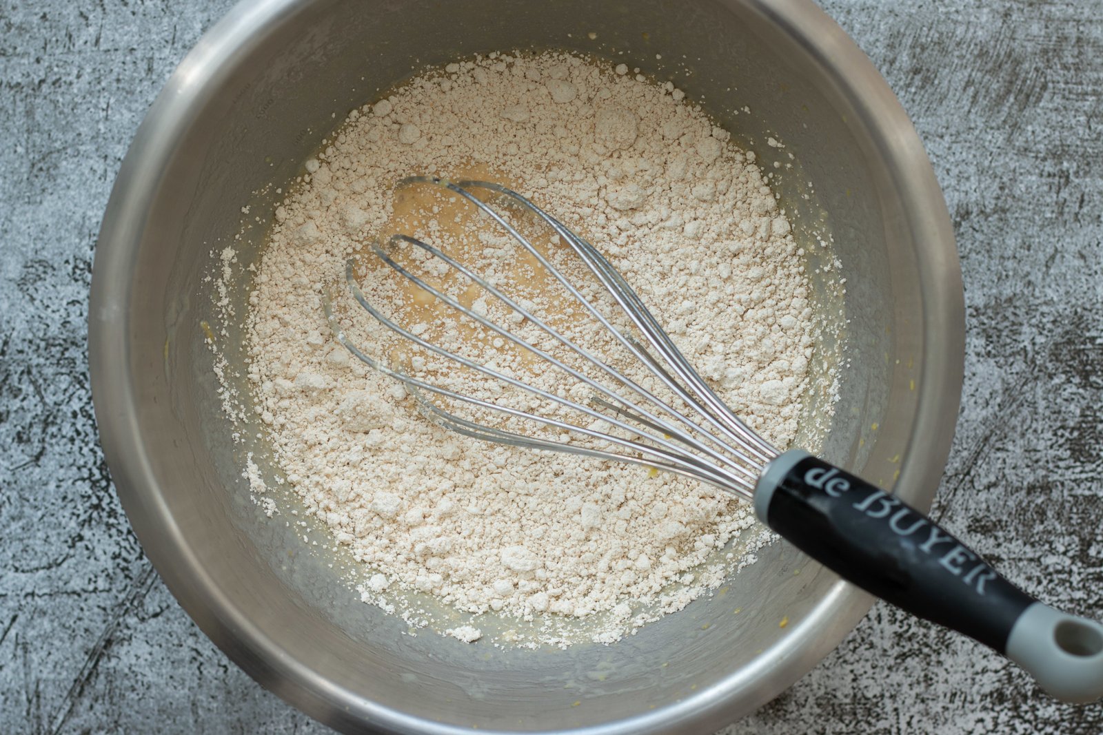 - Dans un saladier, cassez les œufs, ajoutez le sirop d’agave, le yaourt de soja, l’huile désodorisée, le jus de citron, l’arôme, la purée d’amande et les zestes de citron. Fouettez l’ensemble.