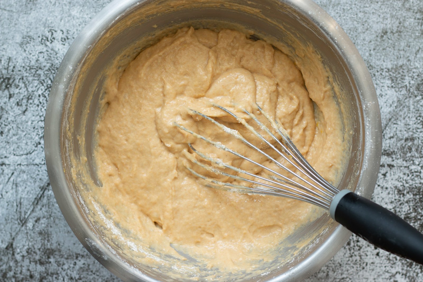 - Incorporez petit à petit la farine et le bicarbonate de cuisine pour ne pas faire de grumeaux. Mélangez pour obtenir une pâte lisse.
