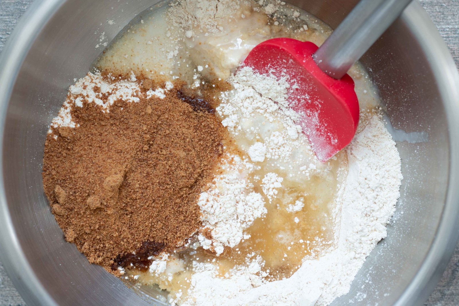 - Ajoutez ensuite l’oeuf, 25 g de sucre de coco, 50 g de crème de soja et 50 g d’huile. Mélangez bien à la spatule.