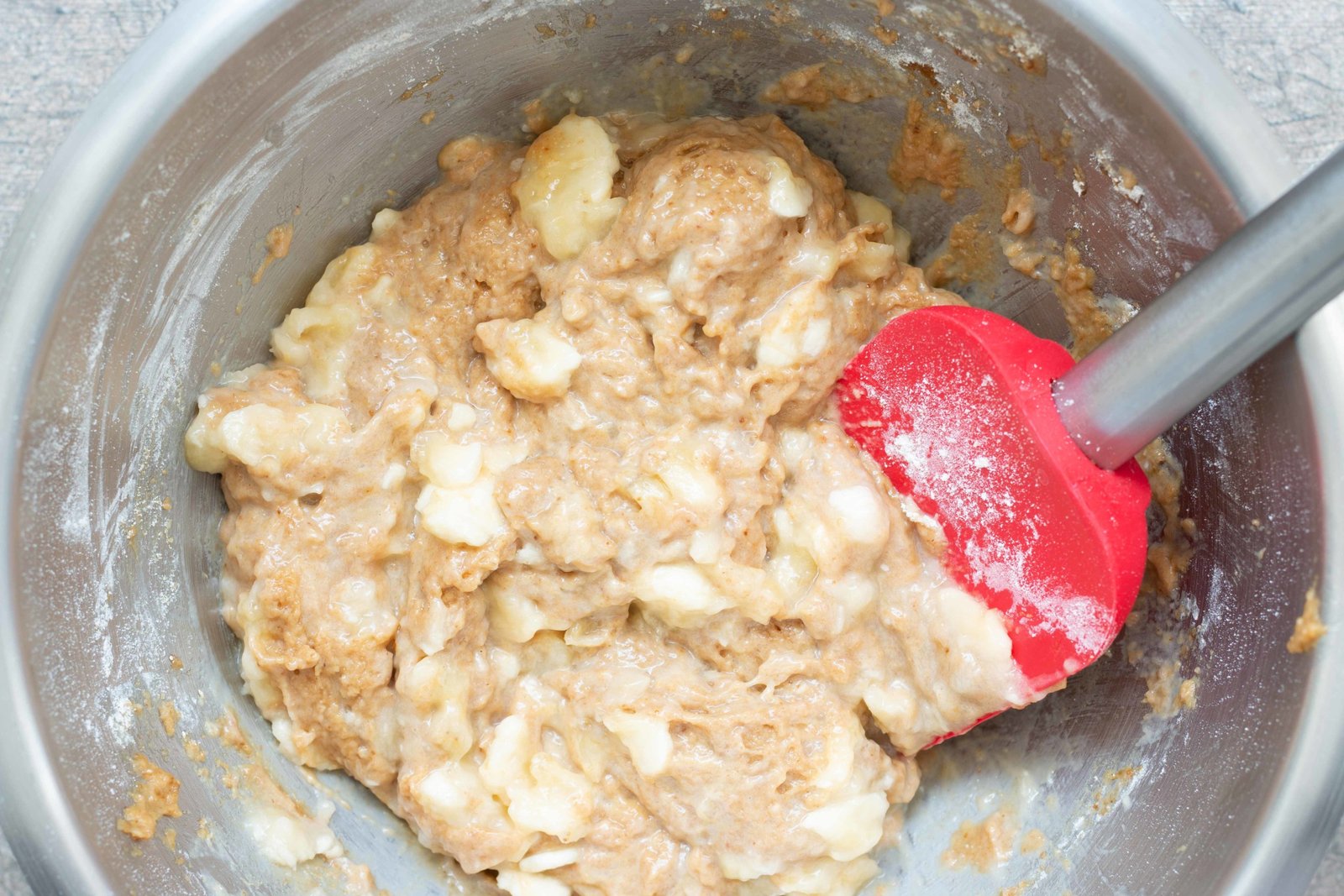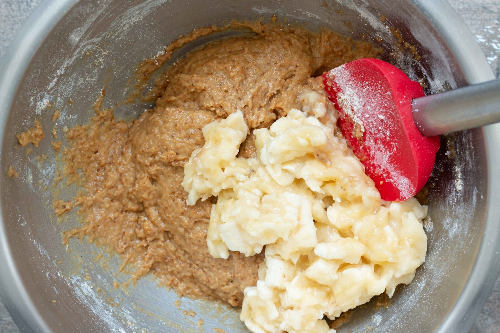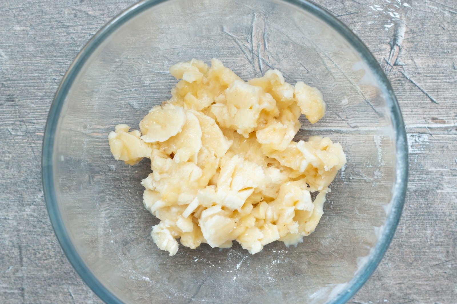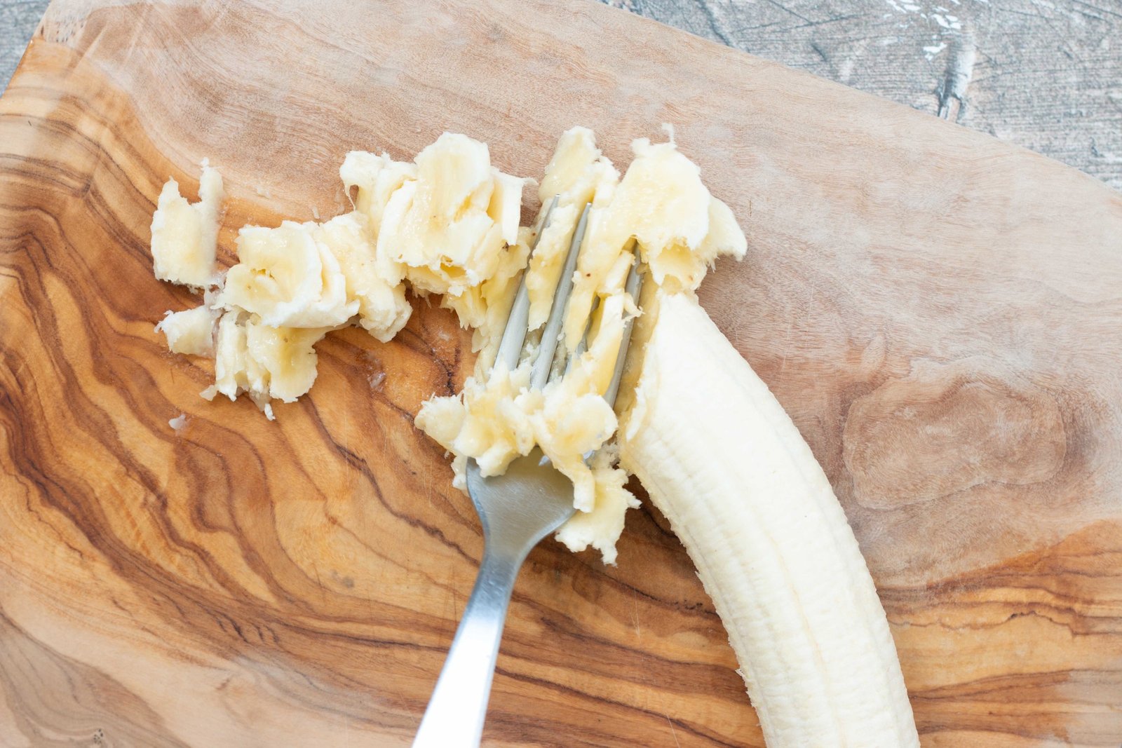 - Ajoutez ensuite la banane préalablement écrasée d’un coup de fourchette. Écrasez très peu la banane pour éviter d’avoir une texture pâteuse à la dégustation.