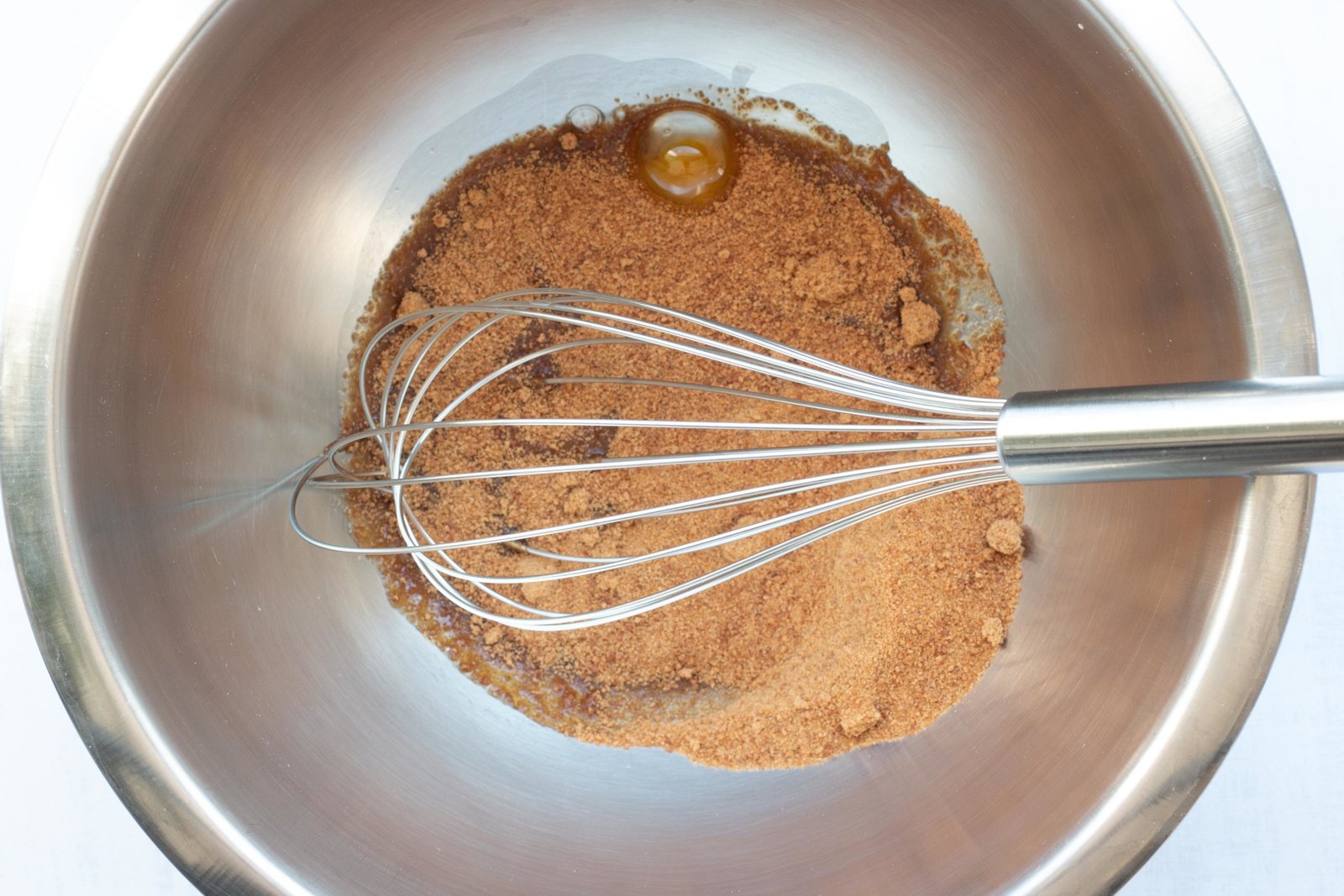 - Dans un saladier, fouettez 1 oeuf avec 60 g de sucre de coco jusqu'à ce que le mélange deviennent mousseux.
