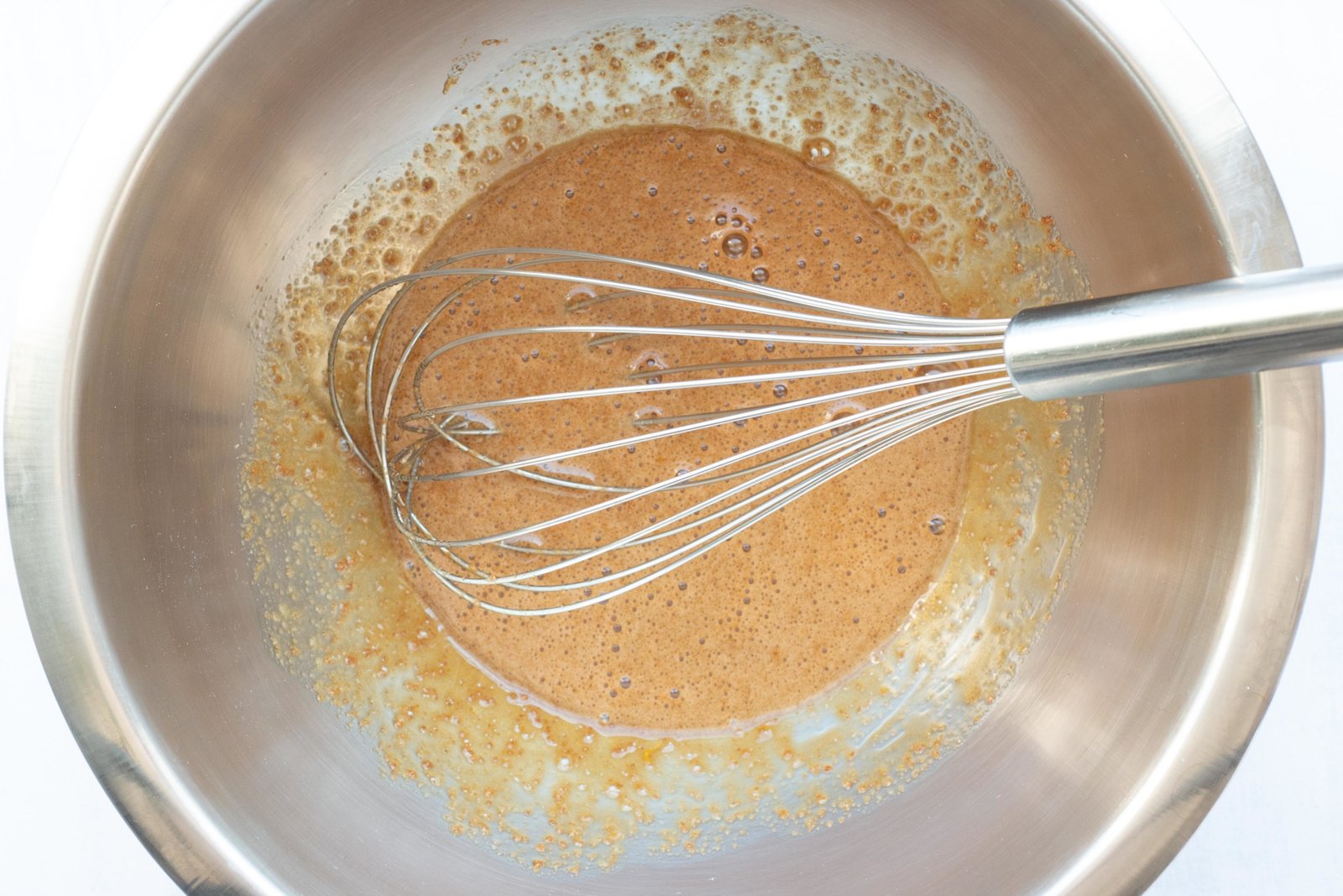 - Dans un saladier, fouettez 1 oeuf avec 60 g de sucre de coco jusqu’à ce que le mélange deviennent mousseux.