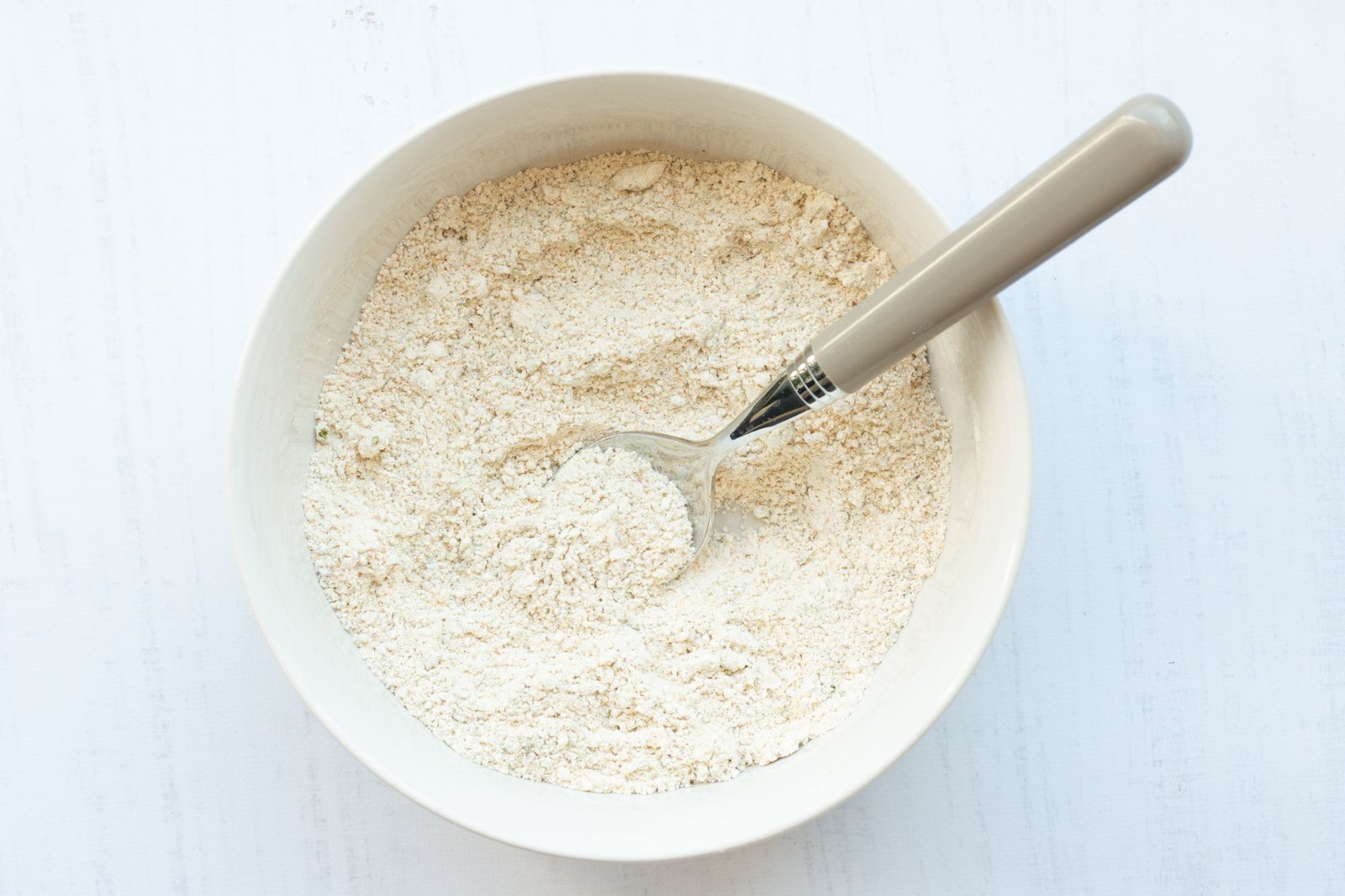 - Dans un bol, mélangez 100 g de farine avec 25 g de poudre de pistache et 3 g de bicarbonate de cuisine.