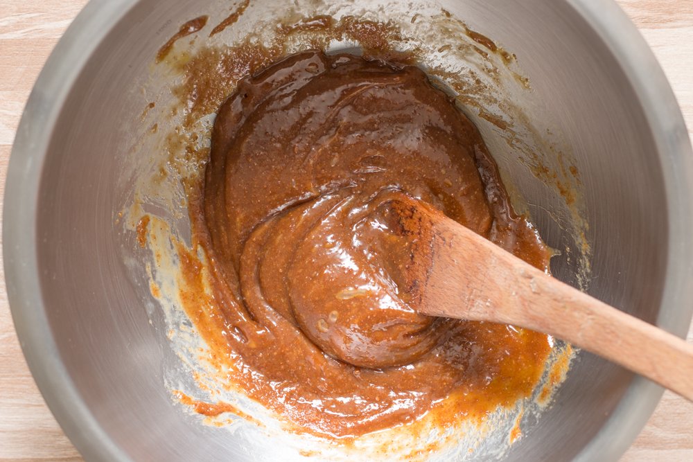 - Incorporez la farine, le bicarbonate et bien mélanger jusqu'à ce que la pâte soit bien amalgamée. Aidez-vous d'une spatule puis finissez avec vos mains pour obtenir une belle boule.