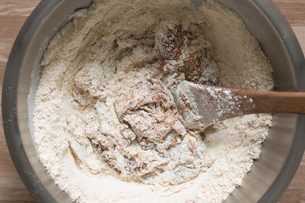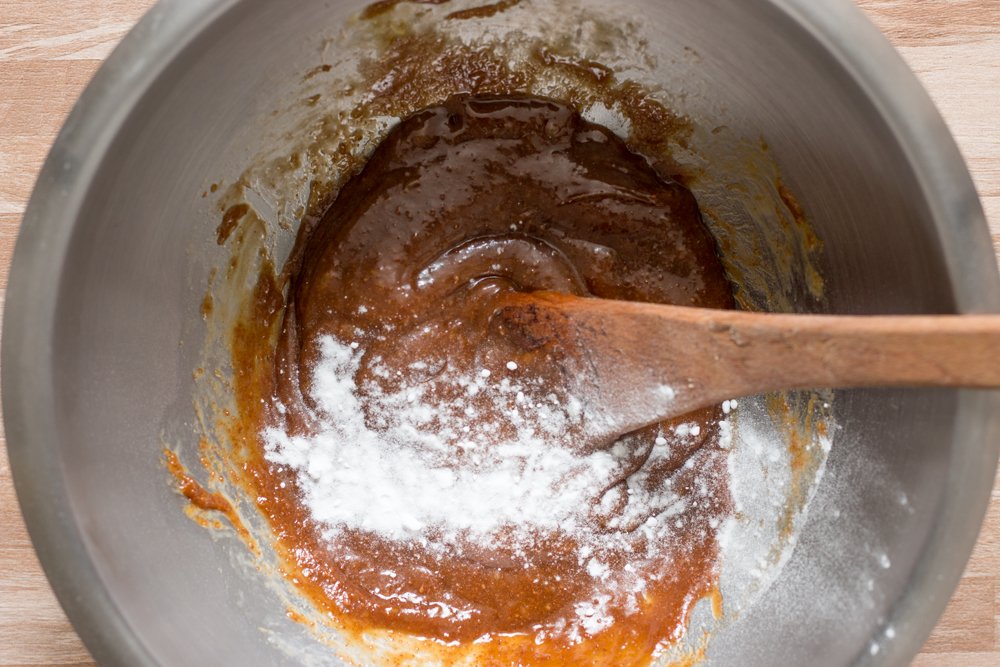 - Incorporez la farine, le bicarbonate et bien mélanger jusqu’à ce que la pâte soit bien amalgamée. Aidez-vous d’une spatule puis finissez avec vos mains pour obtenir une belle boule.