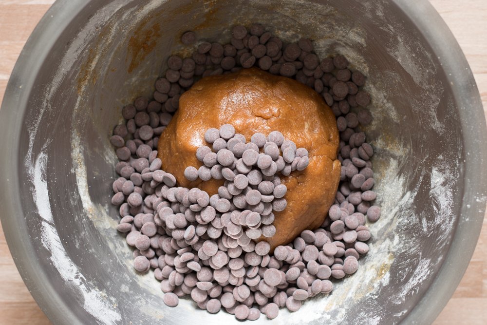 - Terminez en versant les pépites de chocolat et travaillez de nouveau votre boule pour les incorporer.