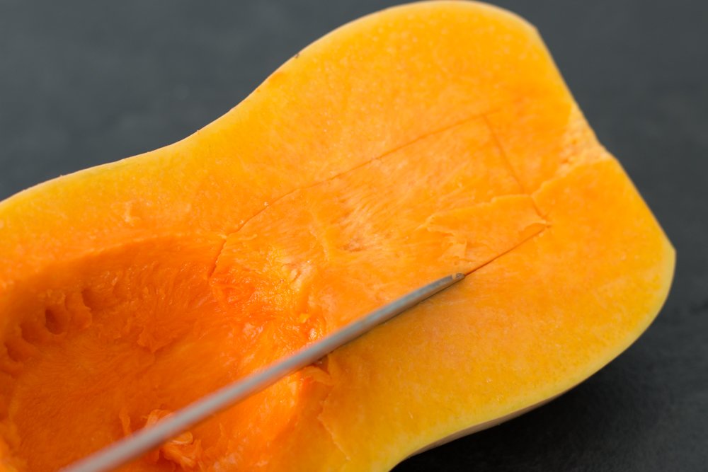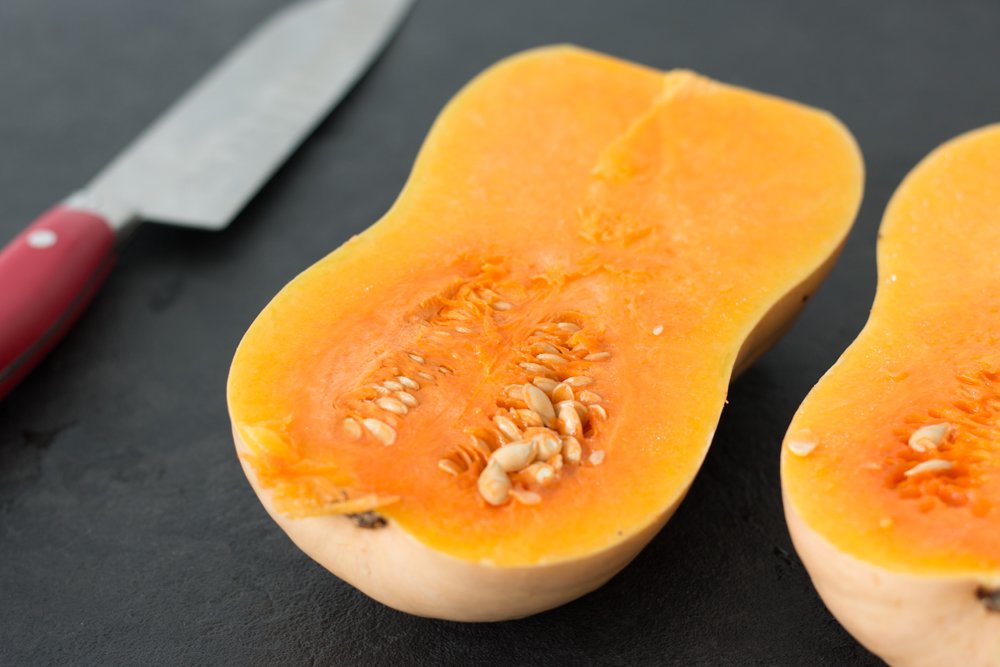 - Lavez le butternut sous l’eau puis coupez le en 2. Coupez la queue.