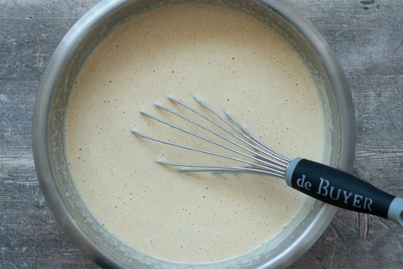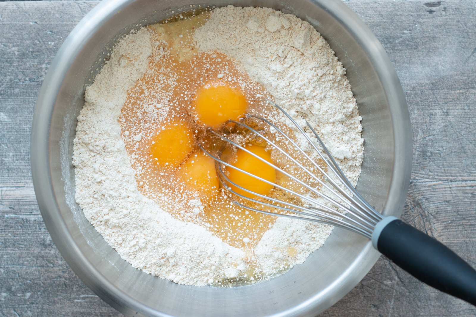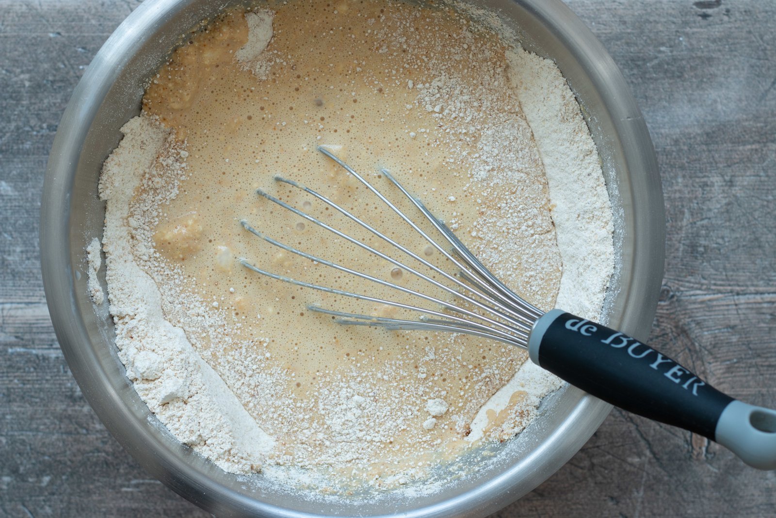 - Faites un puits et cassez 4 oeufs. Fouettez et ajoutez progressivement le lait végétal préalablement tiédi. Le lait légèrement tiédi évite de créer des grumeaux.