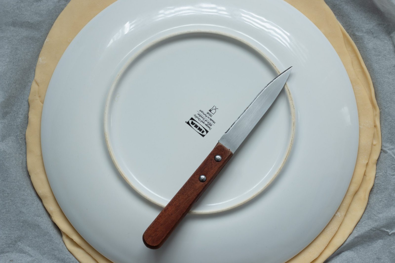 - Prenez un cercle à pâtisserie ou une assiette pour découper les bords de la galettes.