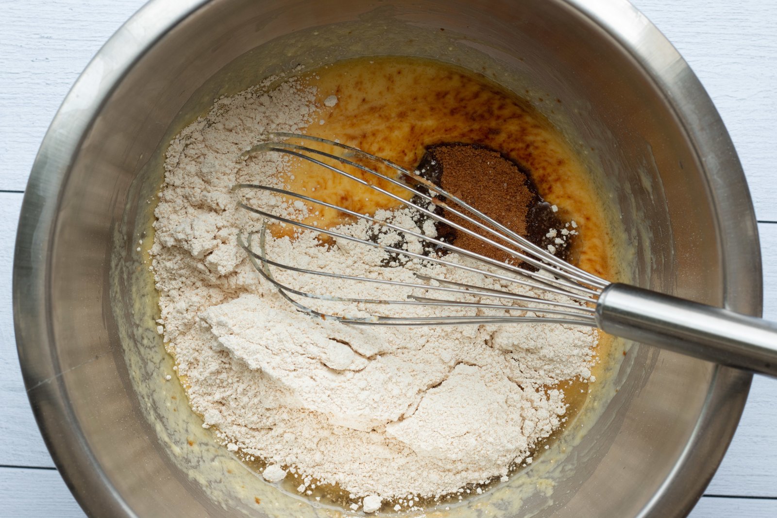 - Versez un pot de yaourt, mélangez avec les oeufs puis ajoutez tous les autres ingrédients (farine, huile, sucre de coco, bicarbonate). Mélangez au fouet l’ensemble. N’oubliez pas de parfumer votre gâteau. Pour ma part, j’ai mis quelques gouttes de vanille liquide et peu de fève tonka fraichement râpée.
