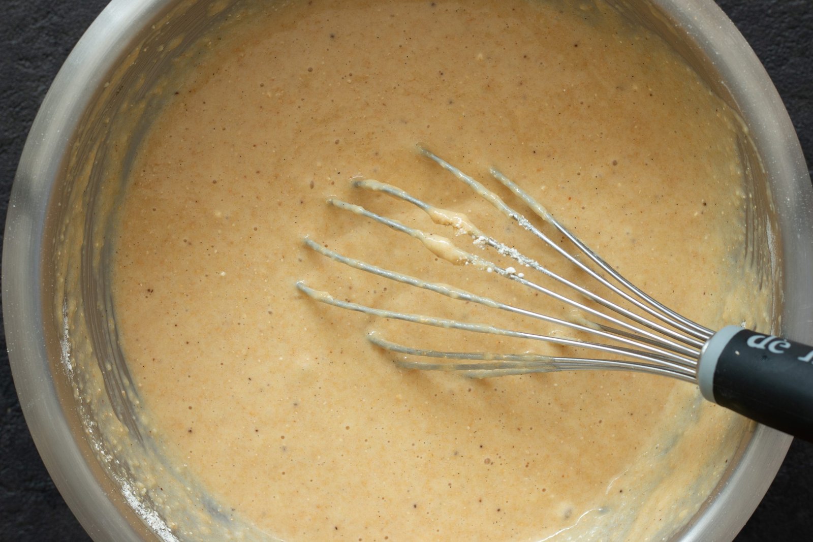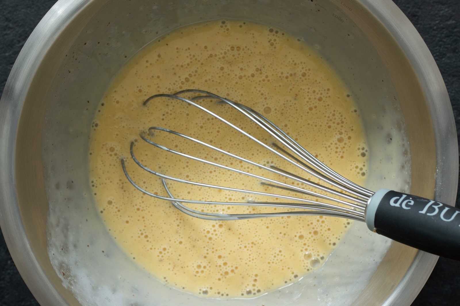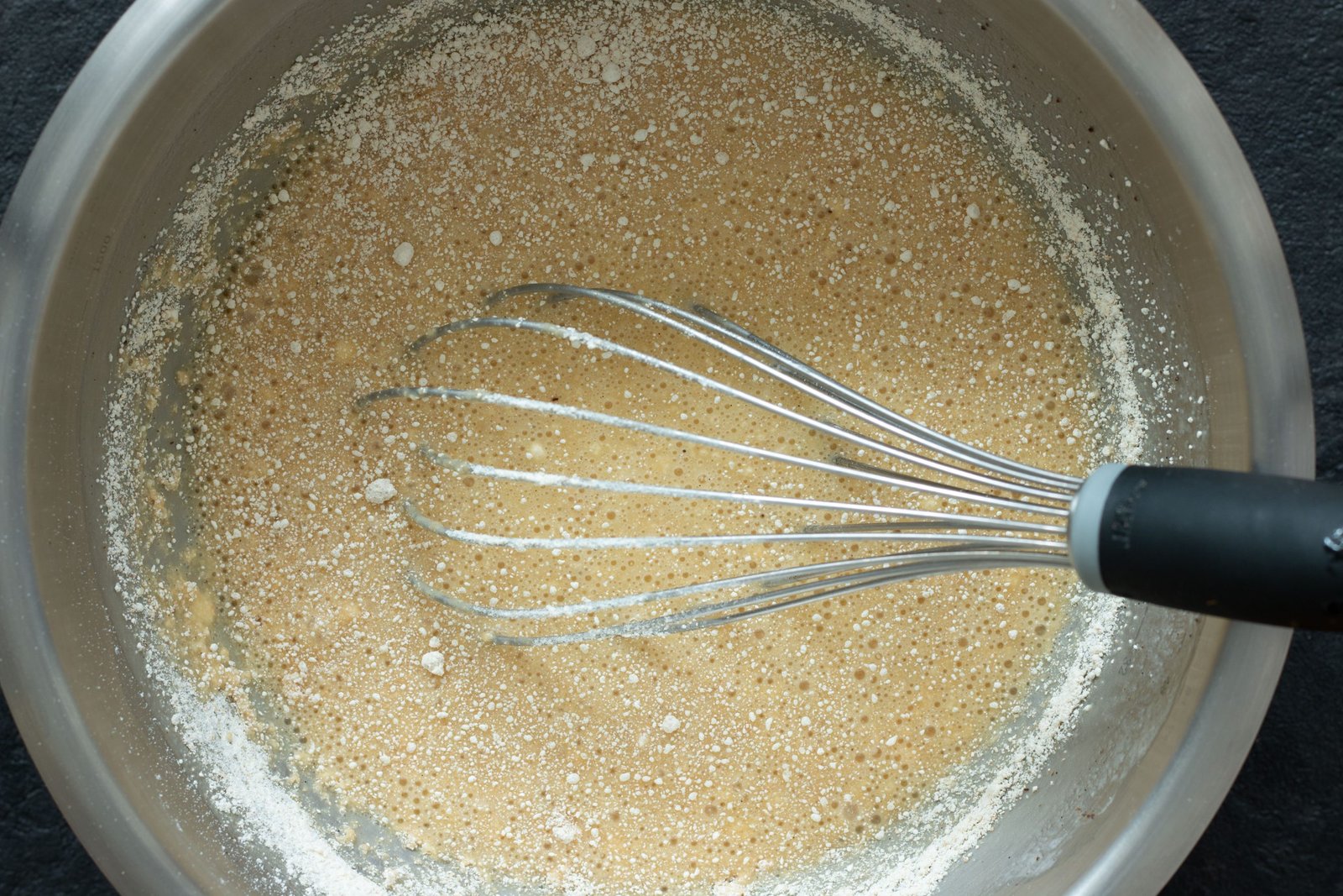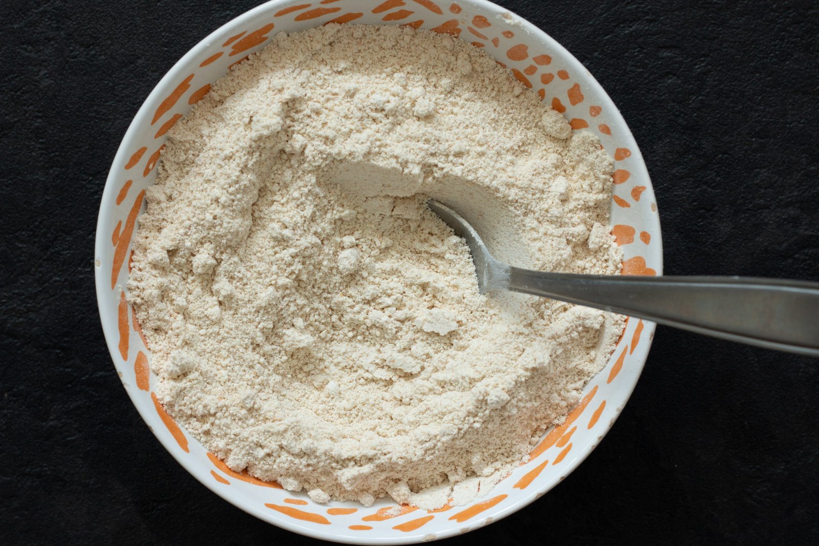 - Pesez à part 150 g de farine, mélangez avec 50 de poudre d'amande et 3 g de bicarbonate de cuisine. Versez ensuite dans le mélange liquide petit à petit pour ne pas créer de grumeaux. Aidez-vous d'un fouet.