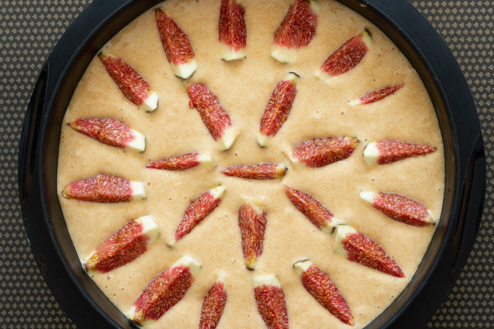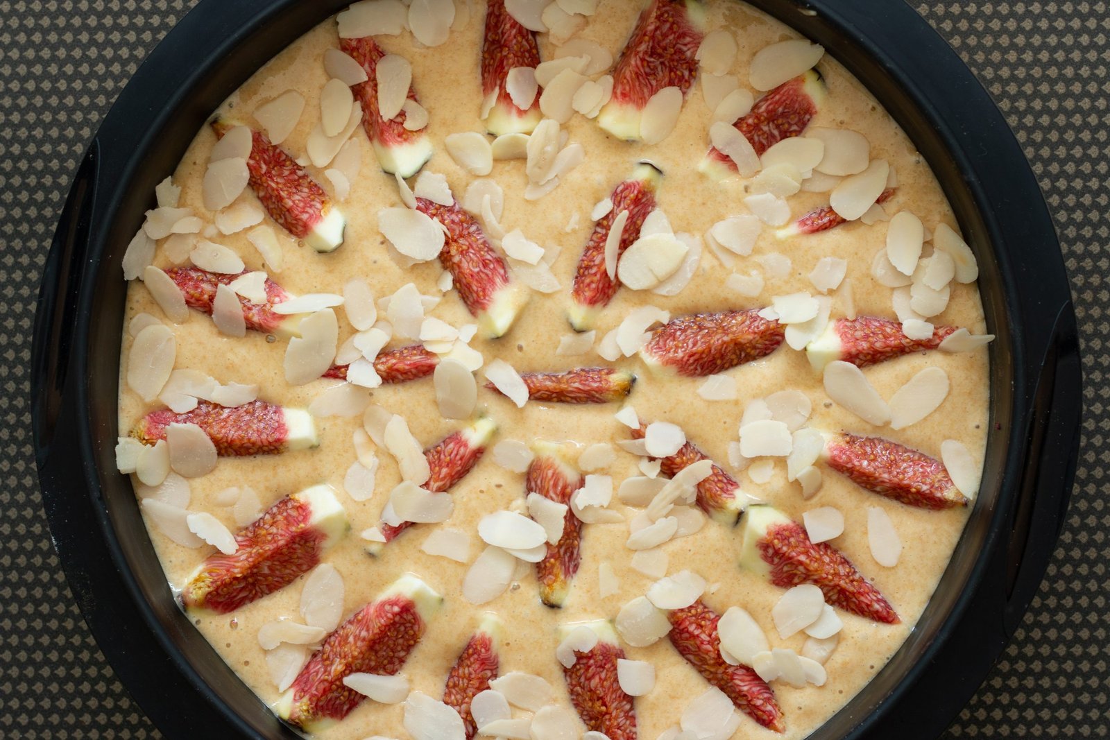 - Coupez vos figues en 4 et placez les en cercle dans votre moule. Parsemez d’amandes effilées.