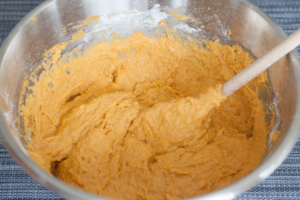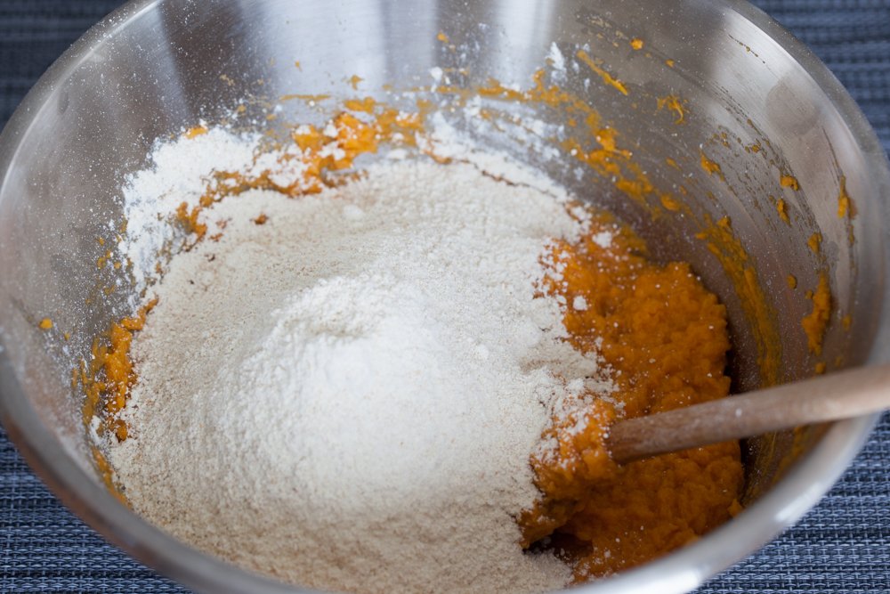 - Ajoutez l’œuf et les épices puis 180 g de farine complète de petit épeautre, la levure chimique (ou bicarbonate + vinaigre de cidre). Salez, poivrez à votre convenance. Laissez poser 20 à 30 min.