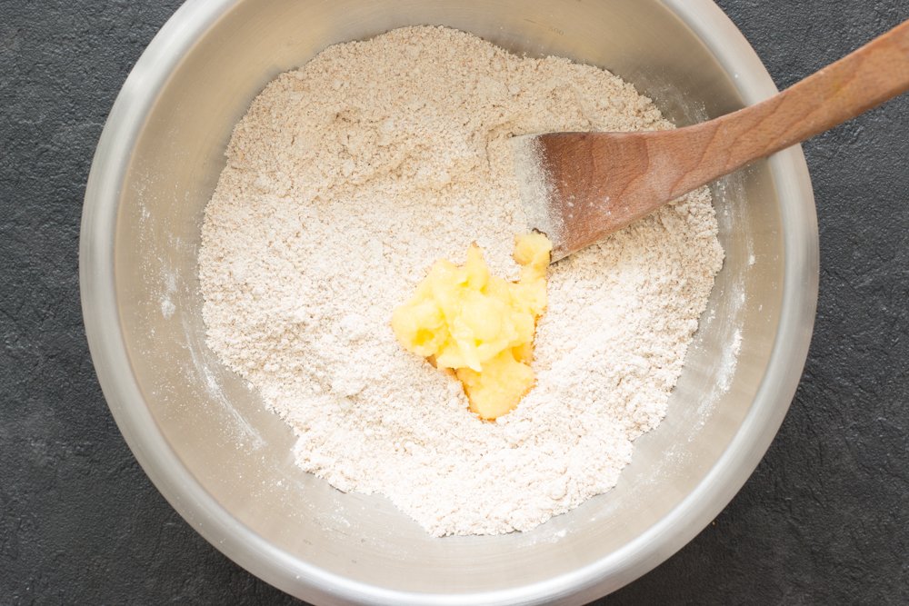 - Ajoutez 30 g de ghee dans le mélange farine + sucre. Le ghee doit être légèrement mou mais pas liquide, comme un beurre pommade. Si besoin, passez le quelques secondes au micro-ondes.