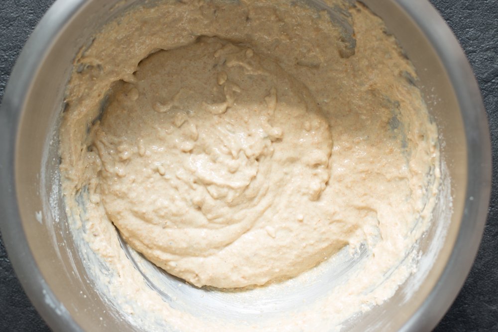 - Dans un saladier, mélangez 150 g de farine complète ou semi-complète avec le bicarbonate de cuisine et 1 cuillère à café de cumin max (selon vos goûts).