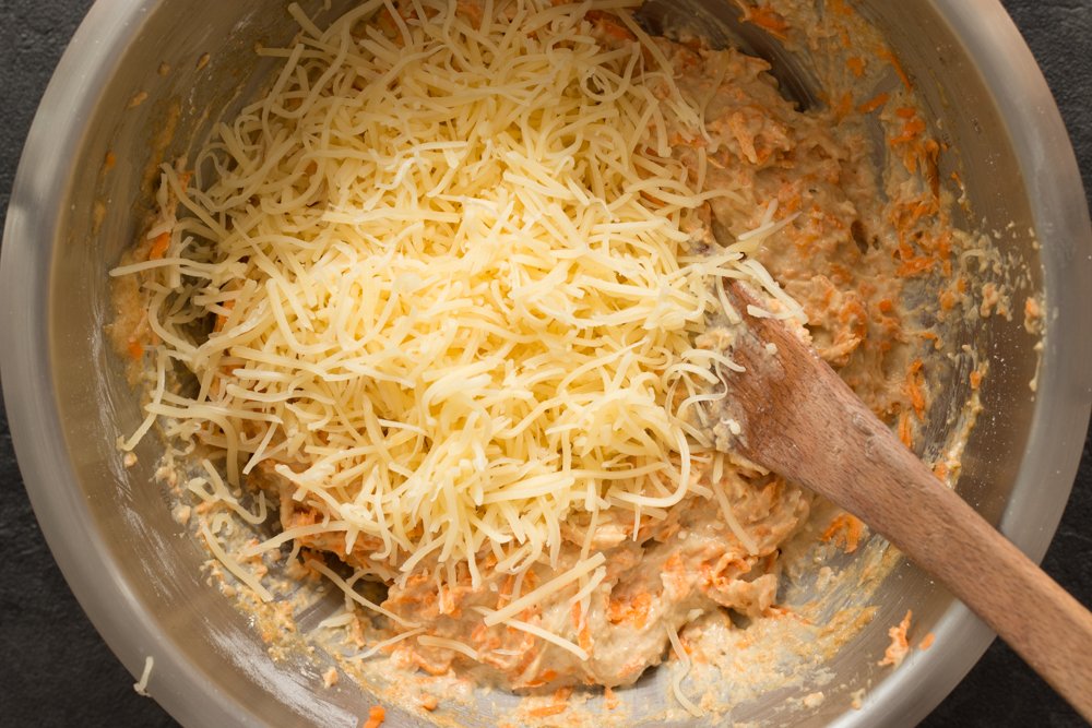 - Salez puis ajoutez 130 g de carottes râpées et 60 g de comté râpé. Mélangez bien pour les incorporer à l’appareil.