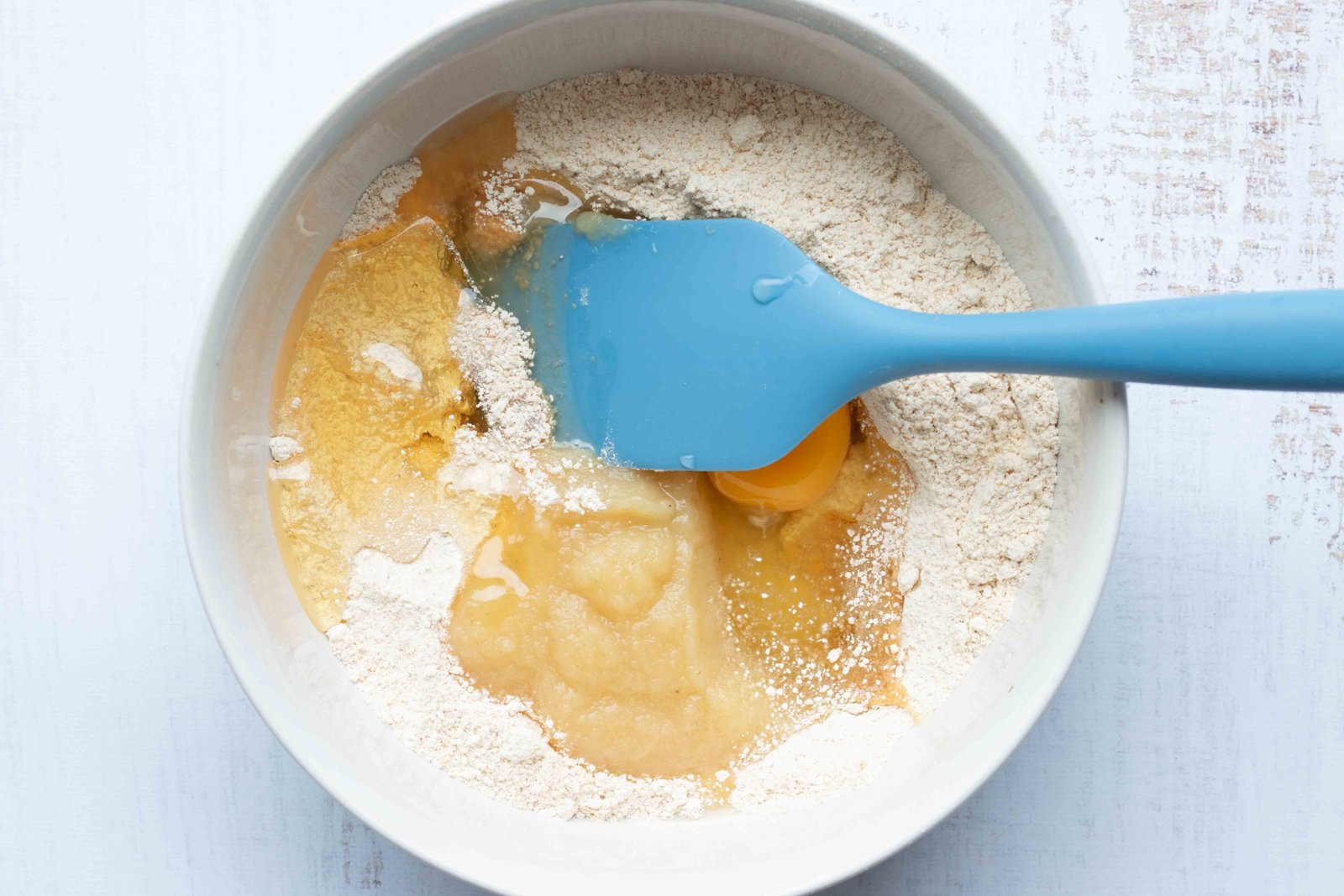 - Versez les ingrédients liquides au mélange précédent : 1 oeuf, 45 g de miel d’acacia ou sirop d’agave, 90 g de compote, 15 g d’huile de cuisson. Mélangez l’ensemble à la spatule.