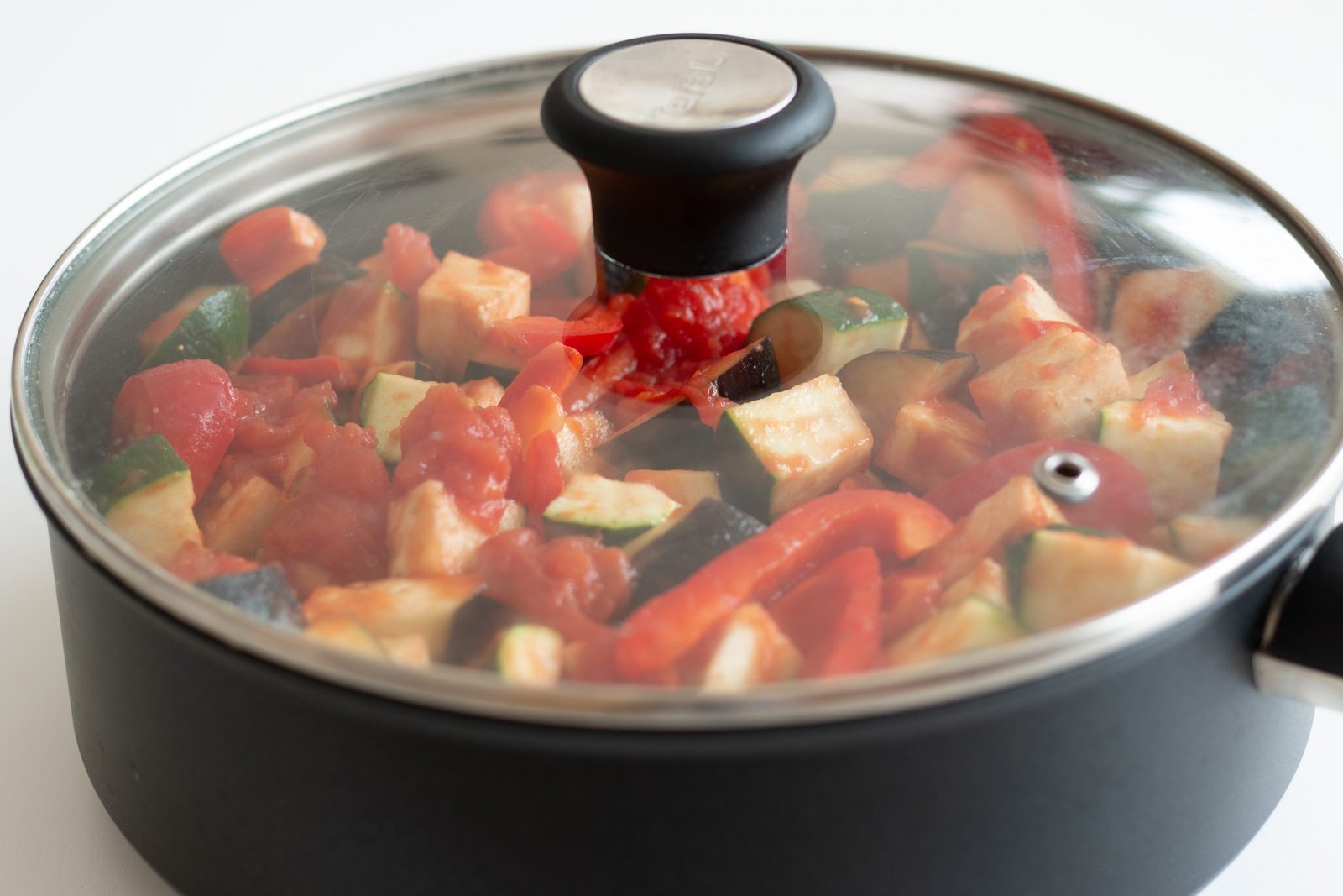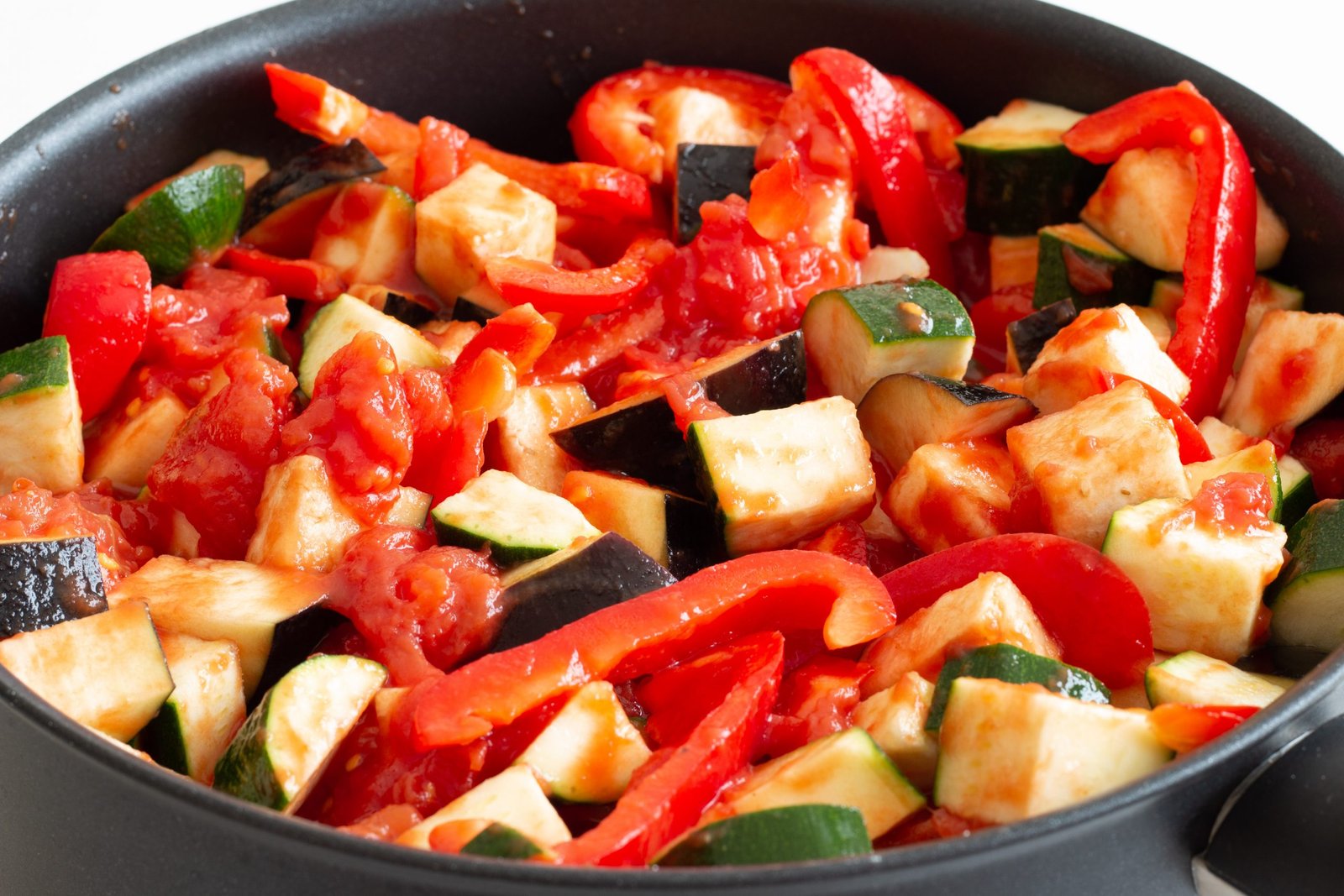 - Ajoutez ensuite les légumes en morceaux puis la boite de tomates pelées (ou tomates fraiches). S’il s’agit des tomates en boite enlevez le trognon (meilleur à la dégustation) et coupez vos tomates en 2. Mélangez l’ensemble pour que les légumes s’imprègnent du jus des tomates. Salez.