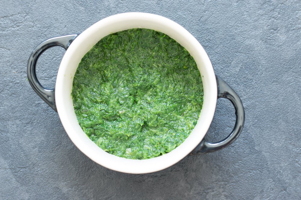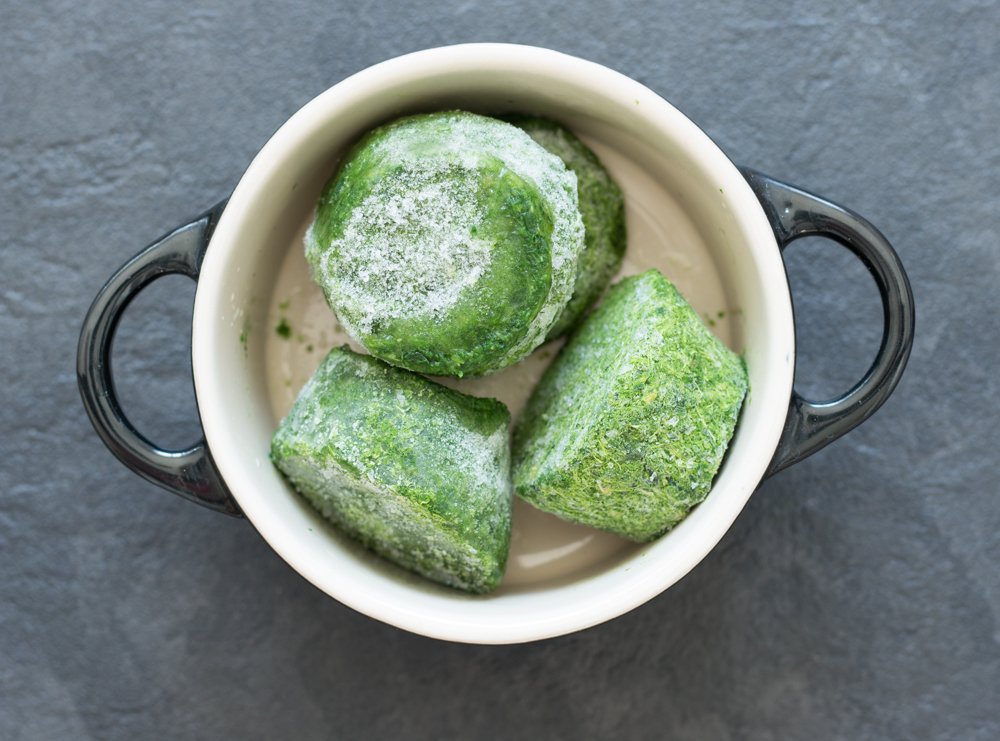 - 160 g d’épinards hachés congelés et nature sans crème. La quantité que j’indique est à adapter à la taille de votre ramequin. Les miens sont assez volumineux.