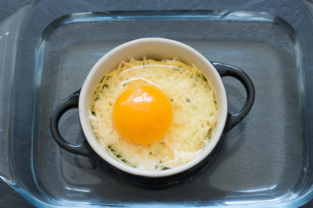 - Placez un peu de comté râpé sur le chèvre puis cassez un oeuf par ramequin (sans crever le jaune).