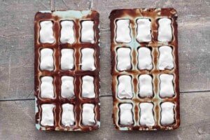 - Versez dans les empreintes du moule. Tapotez le moule sur le plan de travail pour faire remonter les bulles d’air.