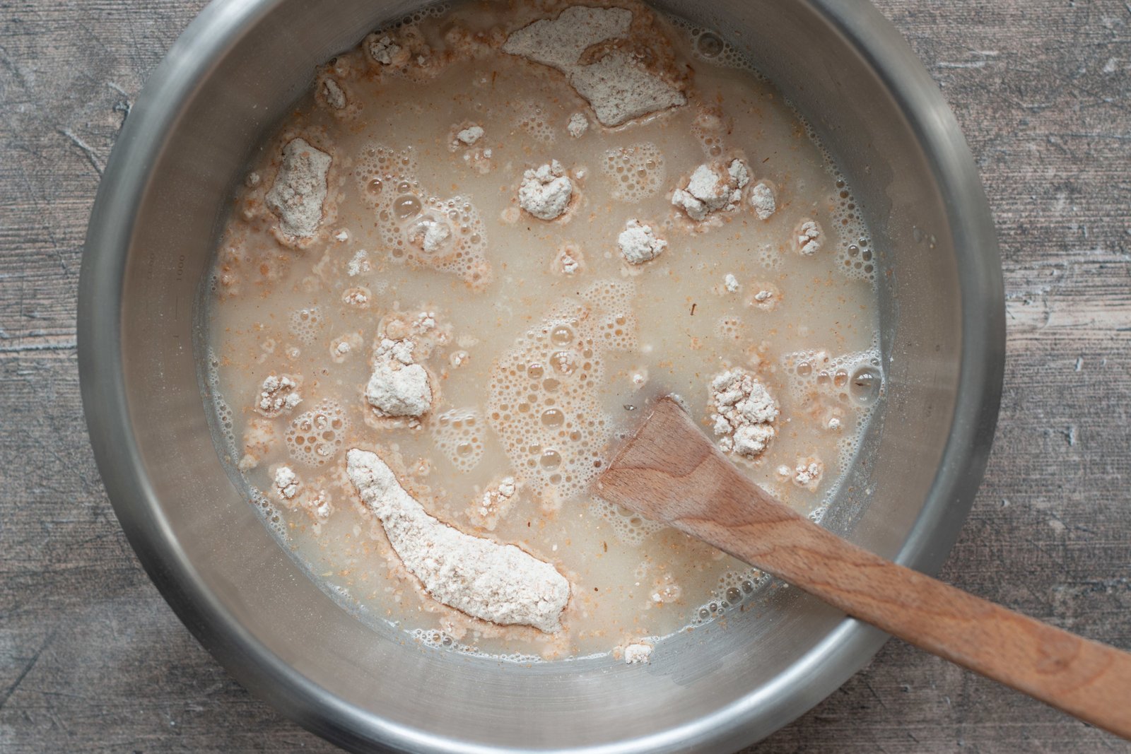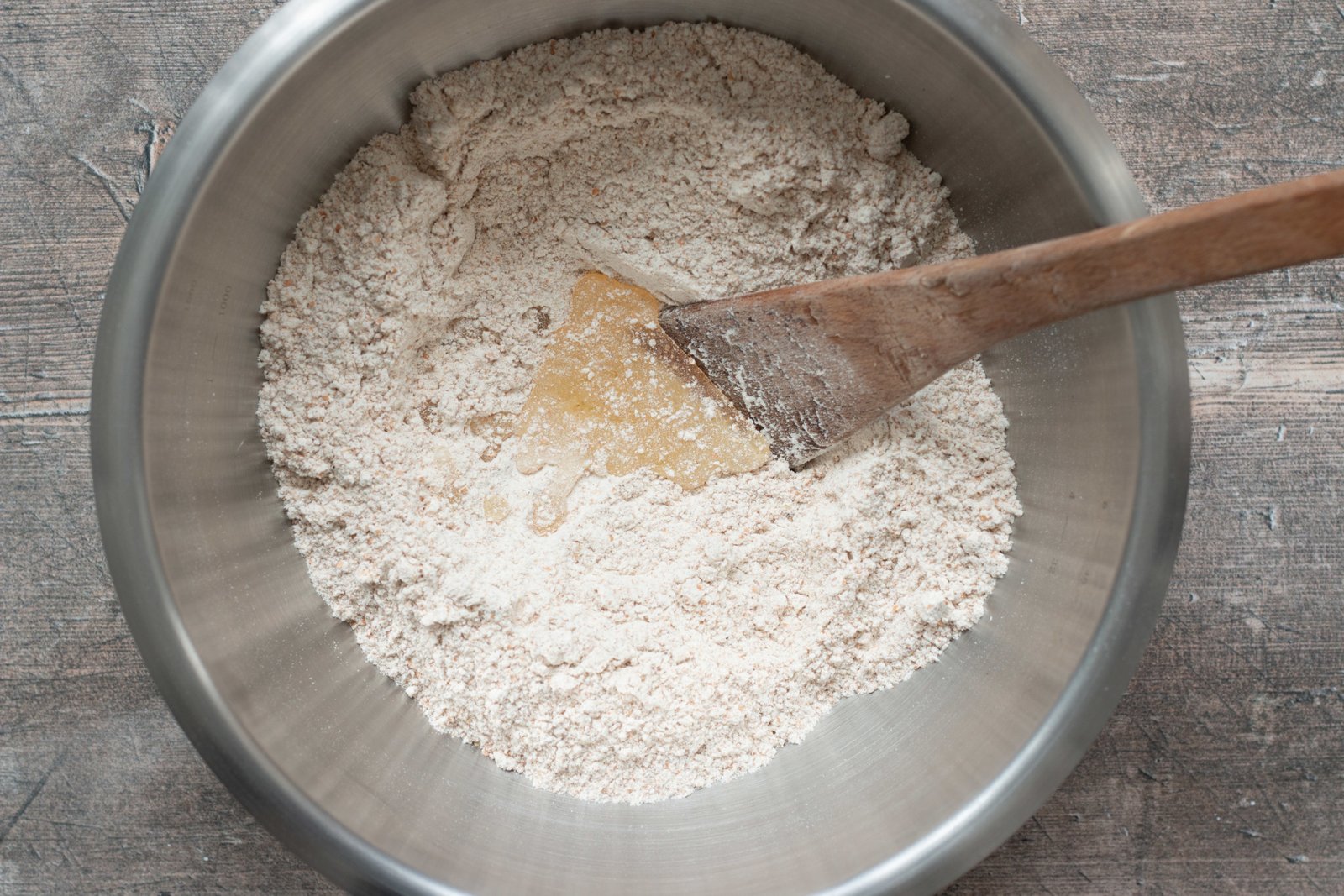 - Ajoutez ensuite tous les ingrédients liquides : 15 g de miel d’acacia et les 270 g d’eau. Bien mélangez tous les ingrédients à l’aide d’une spatule.