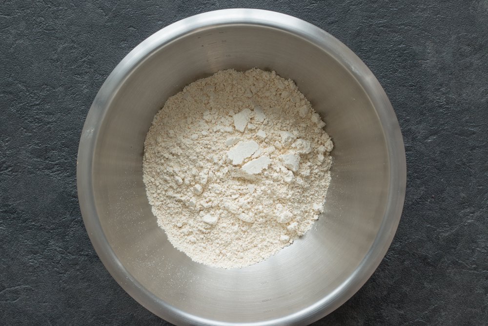 - Dans un saladier versez 250 g de farine de petit épeautre et les 5 g de sel, creusez un puits et y versez les 50 g de beurre de cacao fondu ainsi que 110 g d’eau chaude.