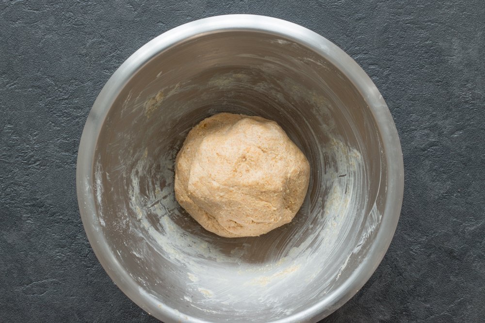 - Mélangez à la spatule jusqu’à ce que la pâte se forme. Terminez à la main pour former une boule.