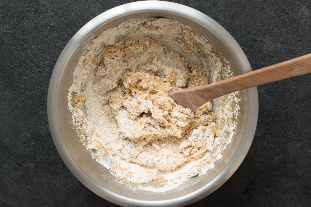 Mélangez à la spatule jusqu’à ce que la pâte se forme. Terminez à la main pour former une boule.