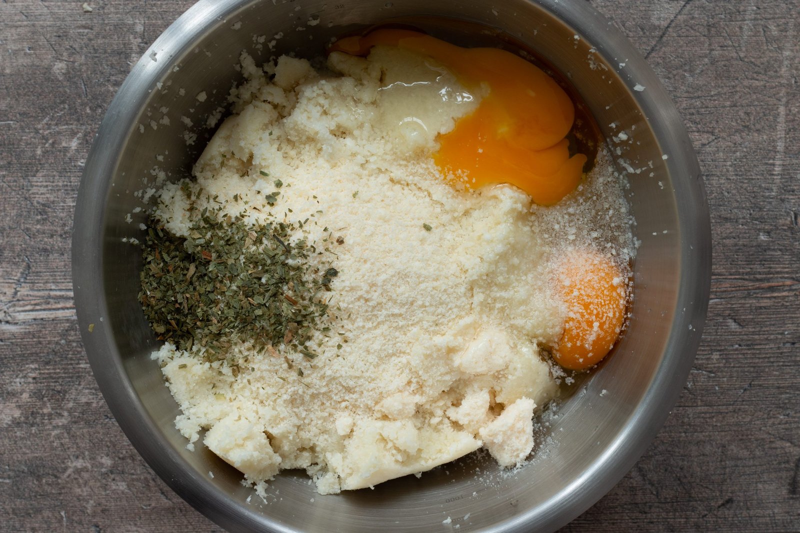 - Dans un saladier, mélangez ensemble la semoule avec 2 œufs, 50 g de parmesan râpé, l’origan séché. Salez poivrez.