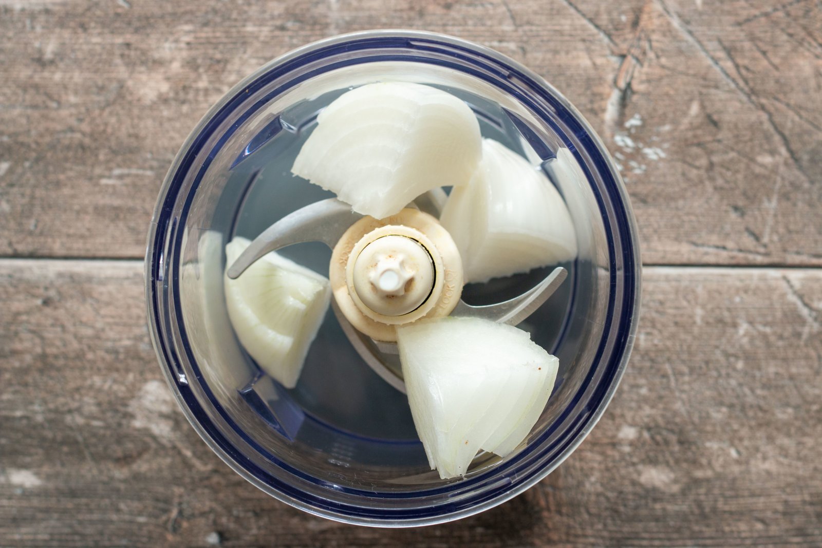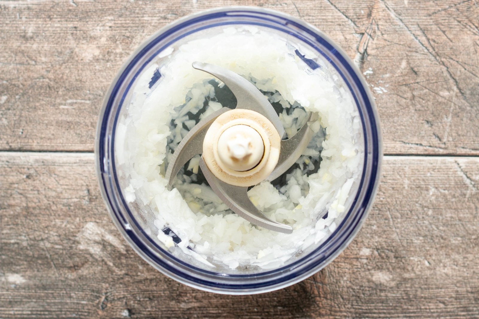 - Commencez par éplucher le demi-oignon et la gousse d’ail puis hachez-les. J’utilise un petit robot mixeur pour aller plus vite.