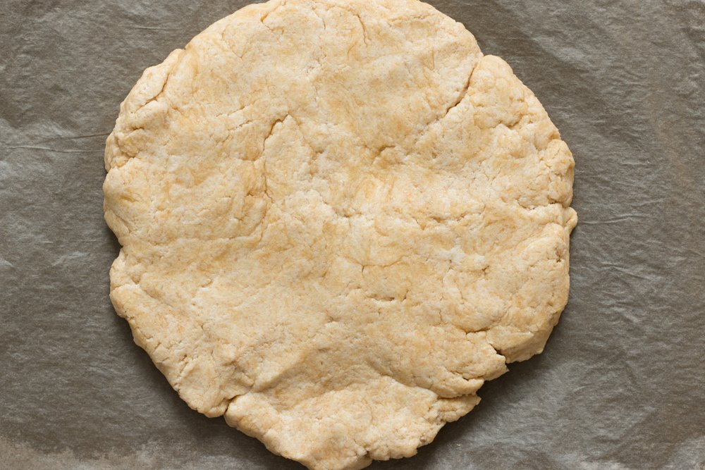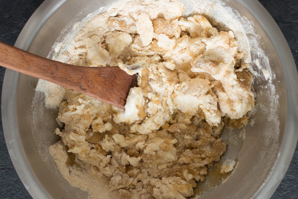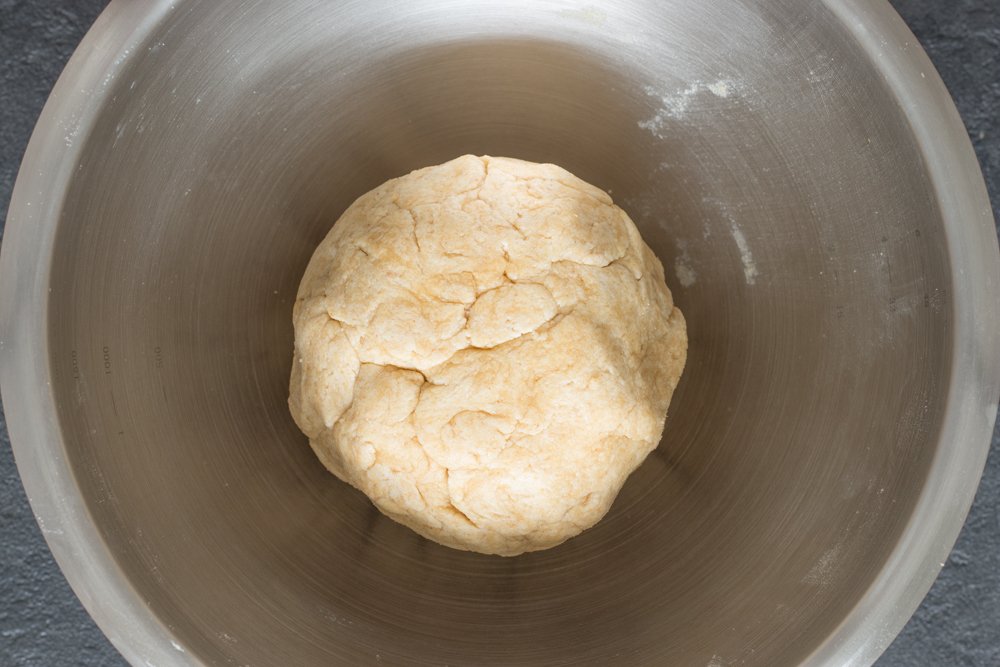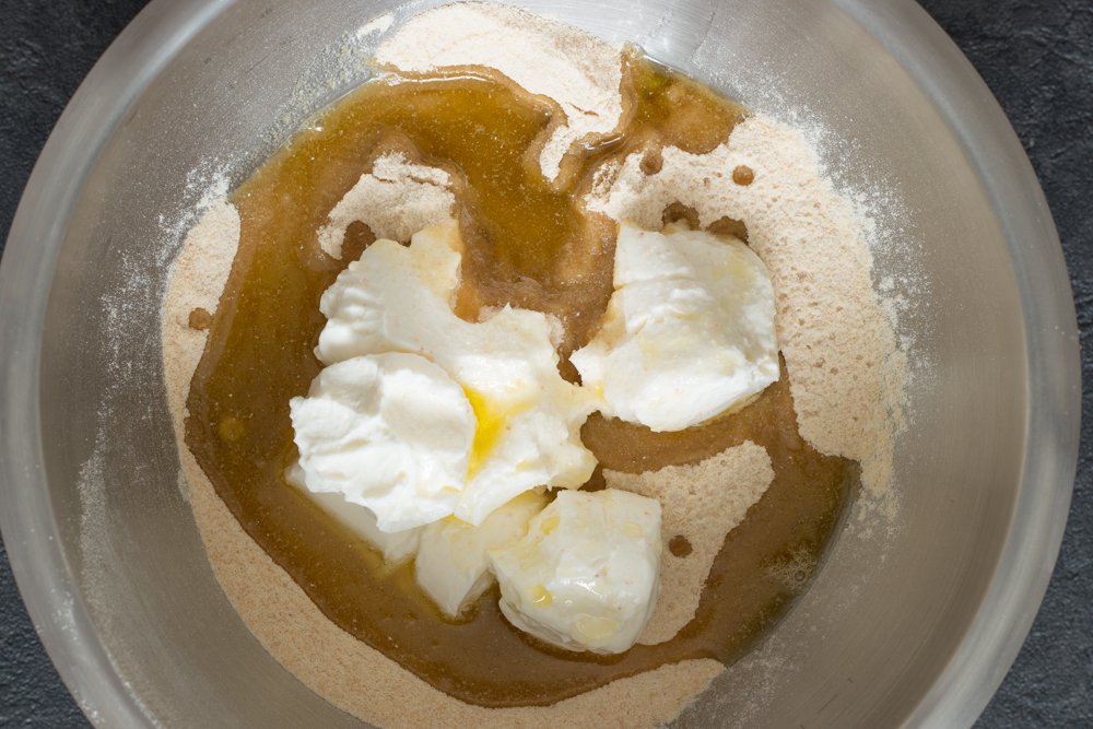 - Dans un saladier, versez 200 g de farine de kamut, 180 g de petits-suisses et 50 g d’huile d’olive, salez l’ensemble. Mélangez à la spatule puis finissez à la main pour former une boule.
