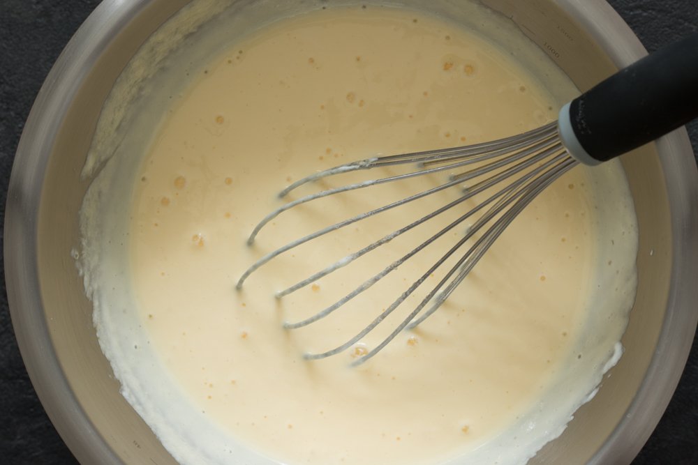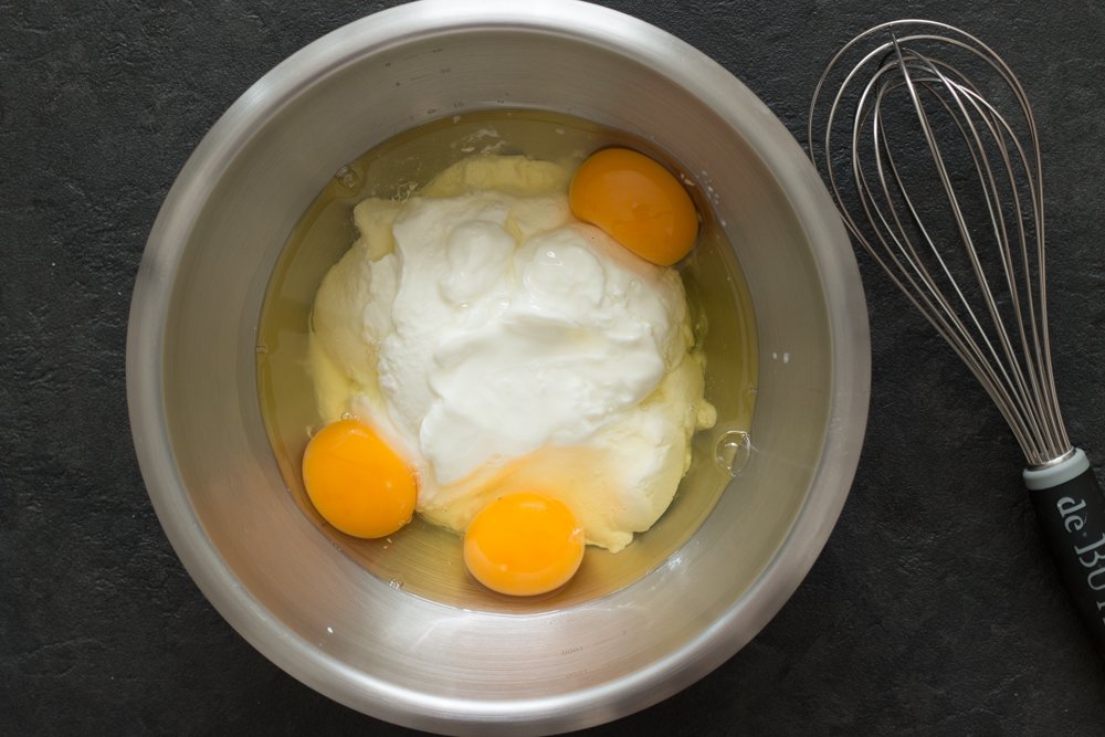 - A l’aide d’un fouet, battre 3 oeufs avec 400 g de fromage blanc.