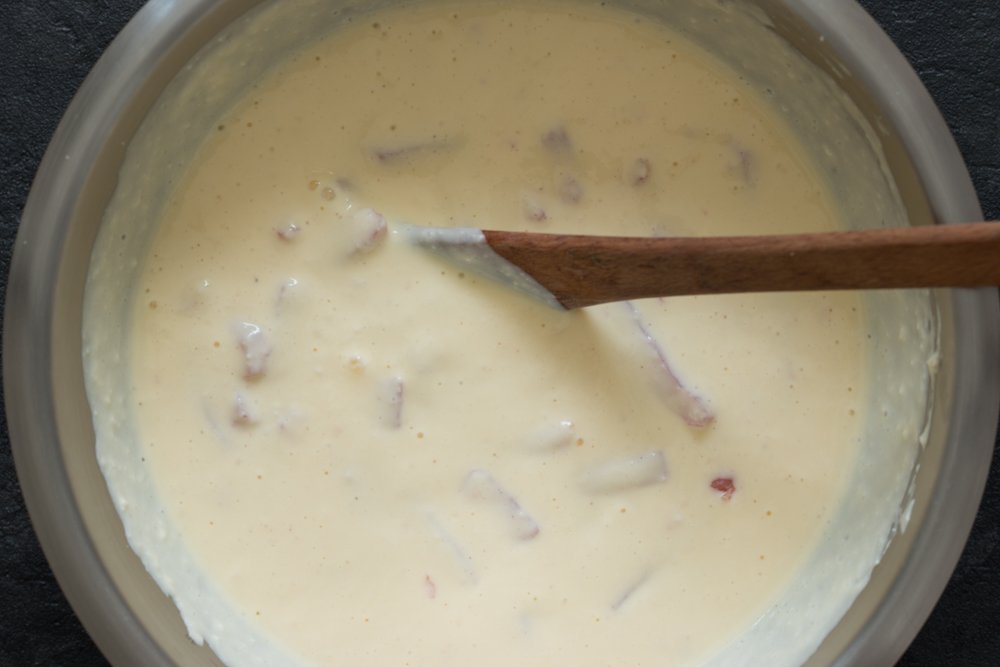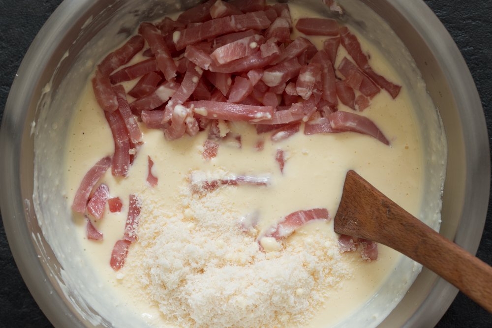 - A l’aide d’un fouet, battre 3 œufs avec 400 g de fromage blanc. Ajoutez 60 g de parmesan et 200 g de lardons allégés.