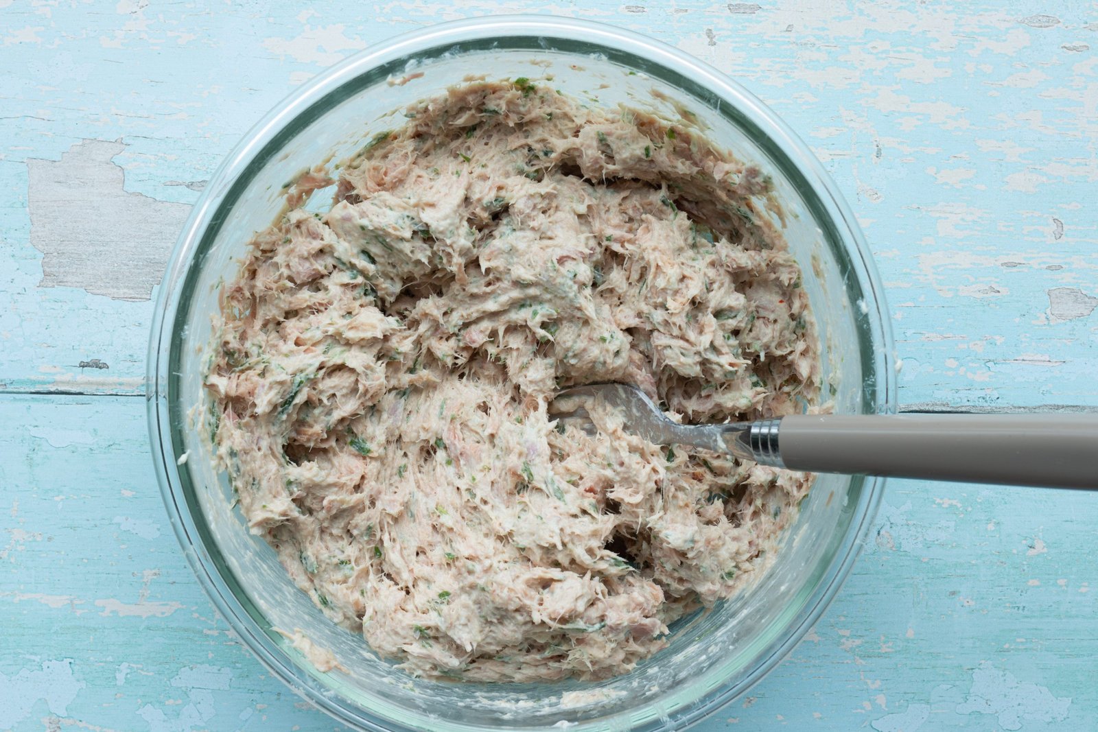 - A l’aide d’une cuillère à soupe, mélangez le thon avec le reste de la préparation. J’ai pris un saladier pour que ce soit plus simple.