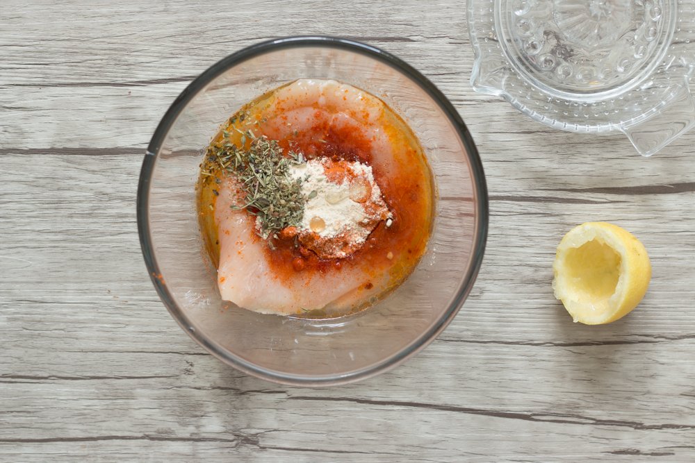 - Dans un petit saladier, mélangez l’ail en poudre, le paprika, les herbes de provence, le sel, le poivre, les 2 cuillères à soupe d’huile d’olive, le miel d’acacia et le jus de citron. Placez vos filets de poulet dans la marinade et retournez dans tous les sens pour bien les imprégner du mélange. Recouvrez le saladier avec du film alimentaire, et réservez au réfrigérateur pendant au moins 1H. Cela permet d’obtenir une viande bien moelleuse.