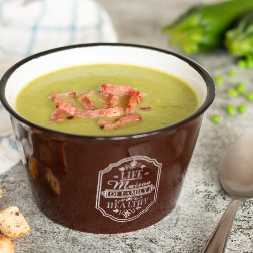 Cette soupe fait partie de mes classiques en ce moment. Tout d’abord parce qu’elle est simplissime à réaliser (peu d’ingrédients) et ensuite parce qu’elle est vraiment délicieuse. Le goût des courgettes se marie parfaitement avec celui des petits pois. Il est très facile de la personnaliser avec des herbes aromatiques ou quelques allumettes de bacon.