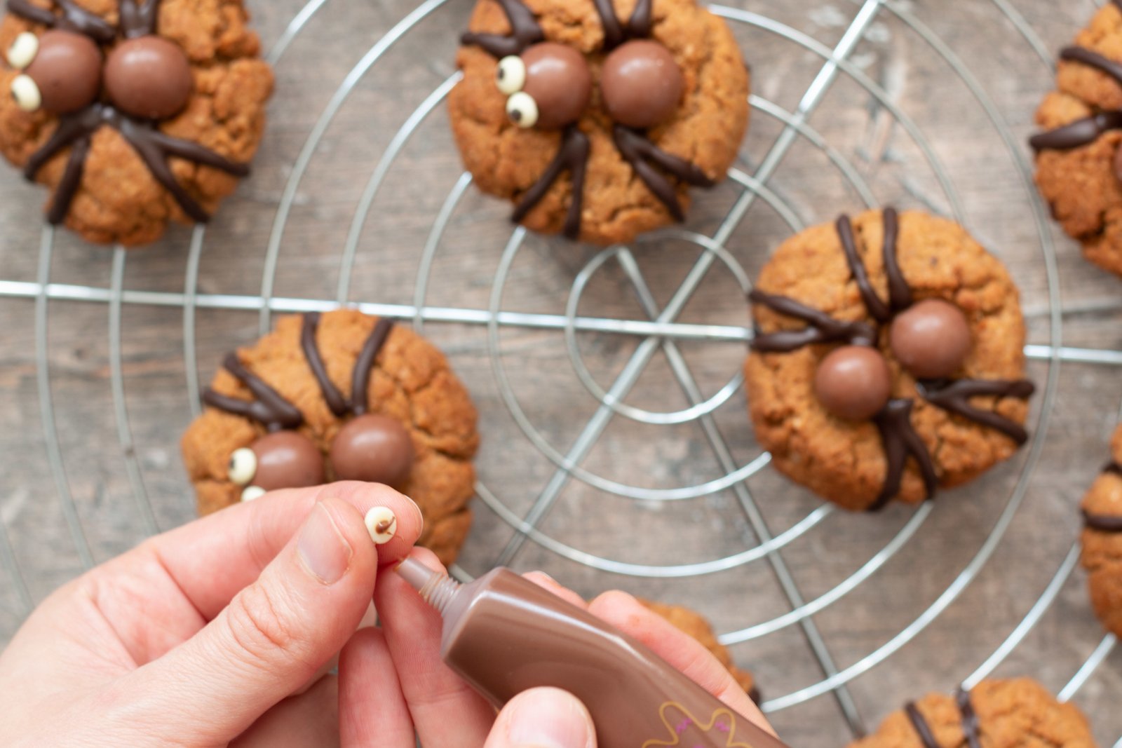 - Coller les yeux sur les araignées à l’aide du stylo pâtissier à la noisette. Ça colle très bien. Vous pouvez essayer avec du chocolat fondu mais il devra être très épais sinon les pépites vont glisser (c’est du vécu!).