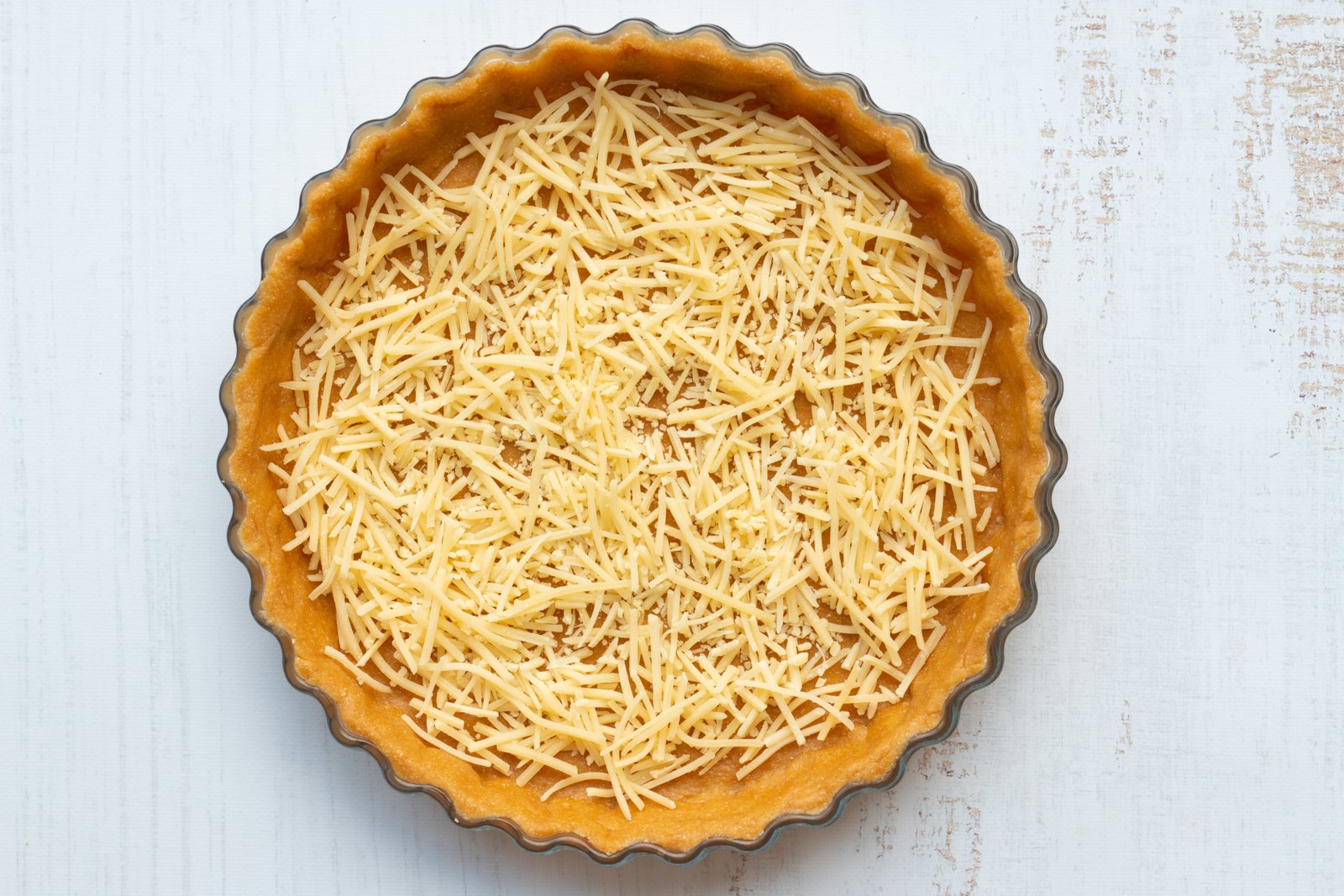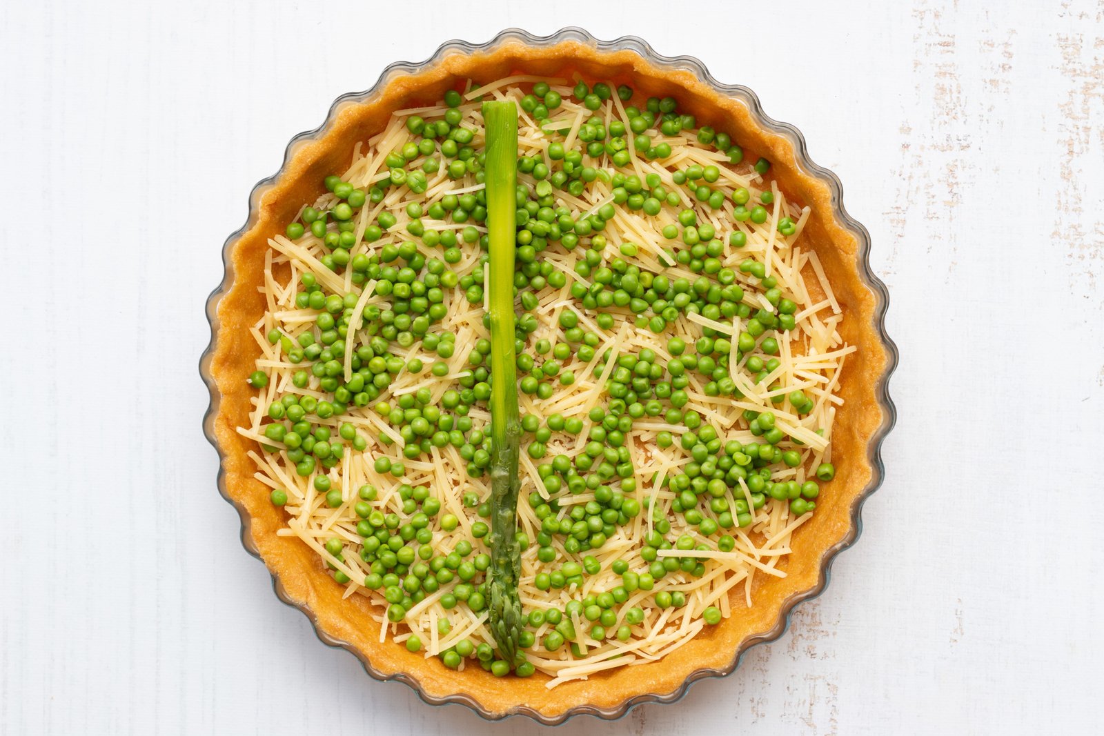 - Étalez votre pâte à tarte dans un moule puis parsemez de comté râpé (100 g). Ajoutez d’abord les petits pois puis les asperges au dessus. Cela permet de ne pas recouvrir les asperges avec l’appareil et donc d’obtenir un joli visuel.