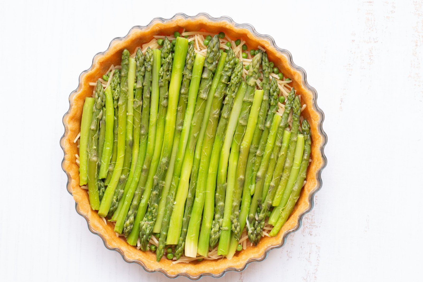 Tarte aux asperges vertes, petits pois et comté