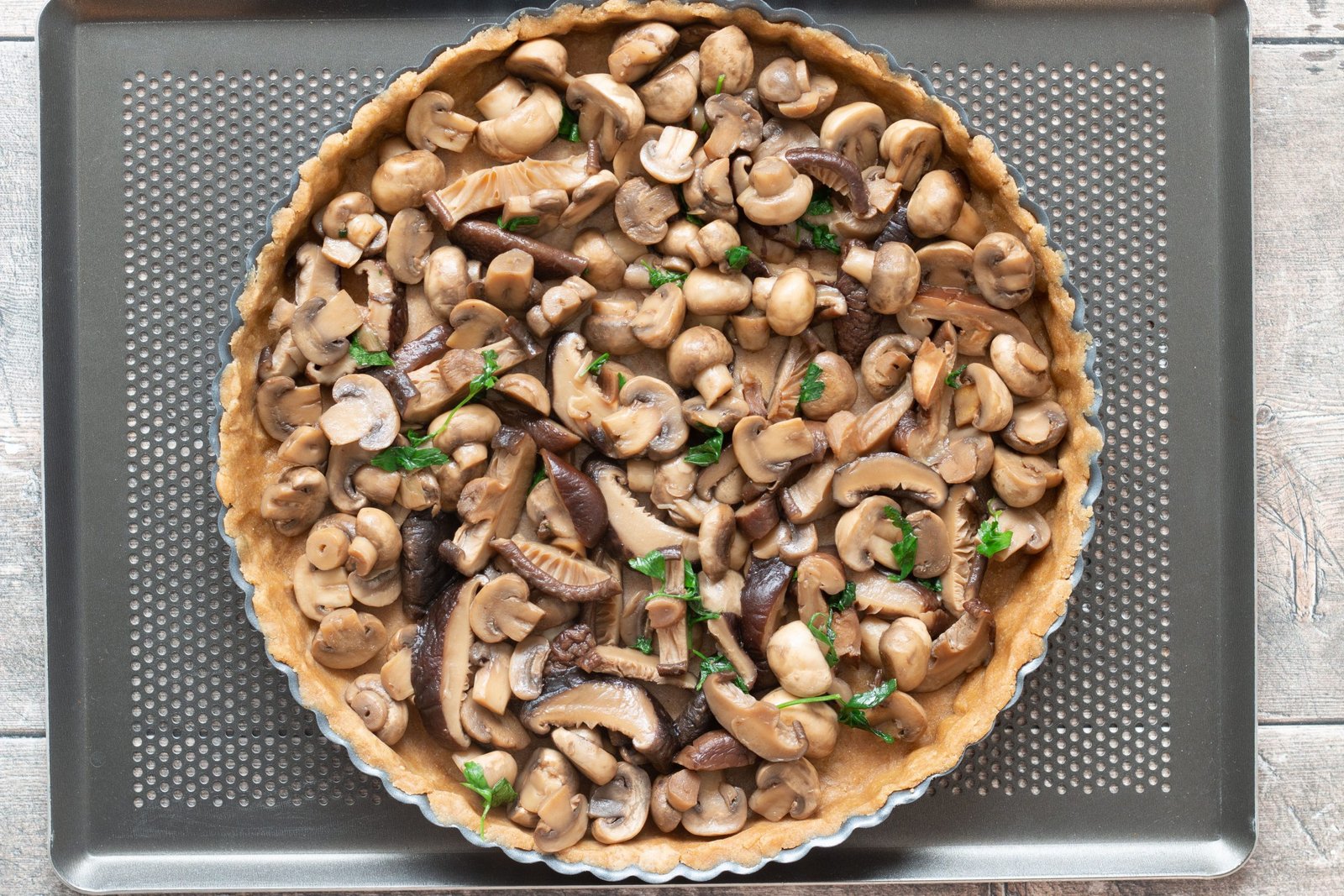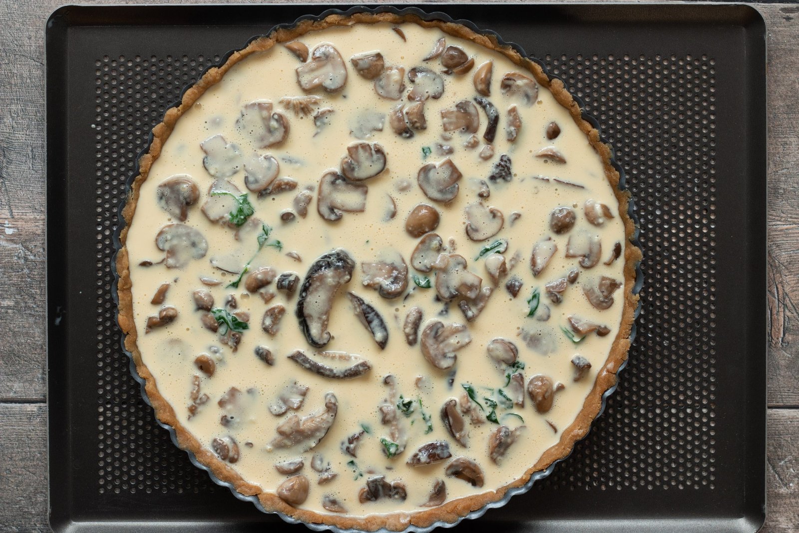 - Étalez les champignons sur la pâte puis versez l’appareil dessus.