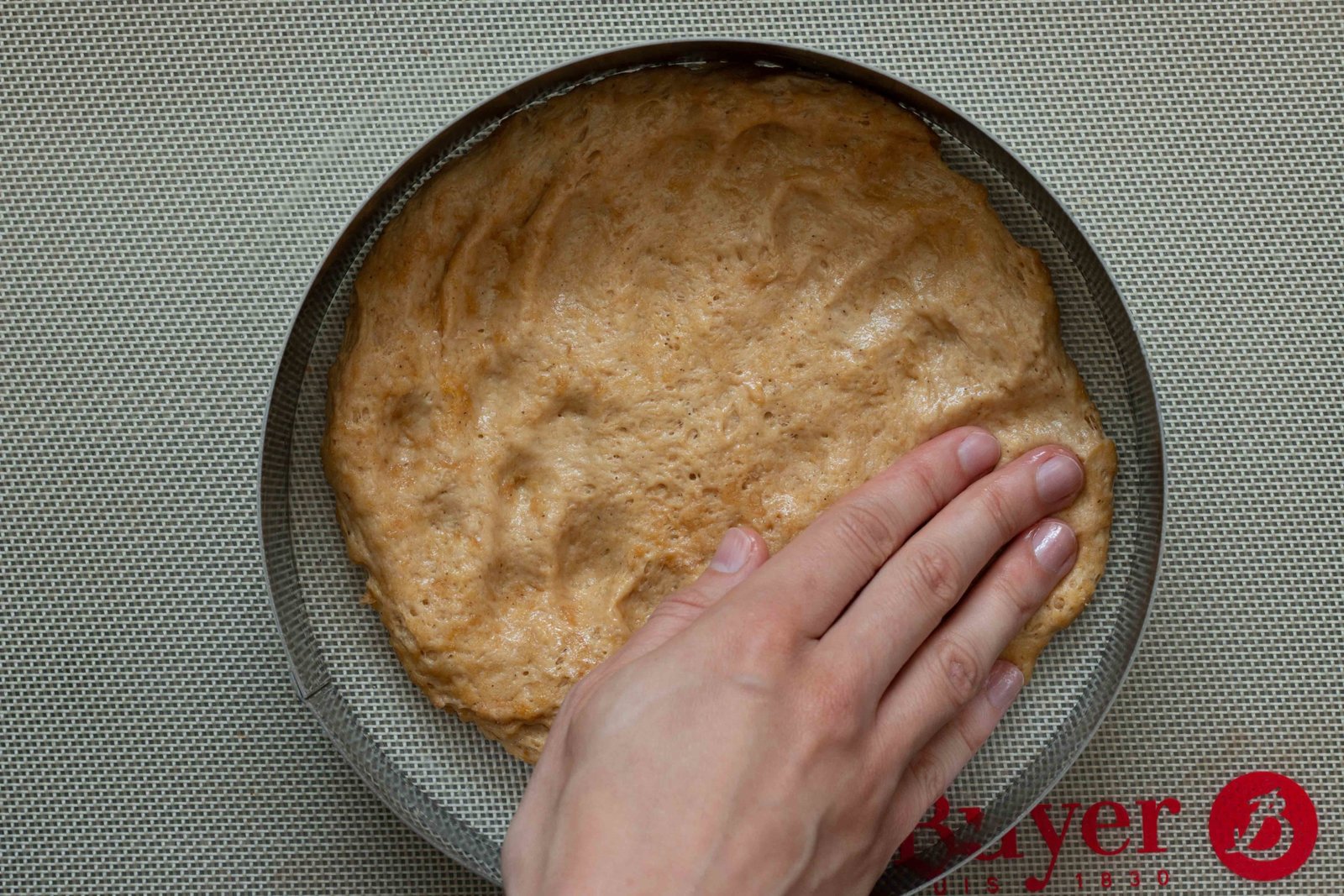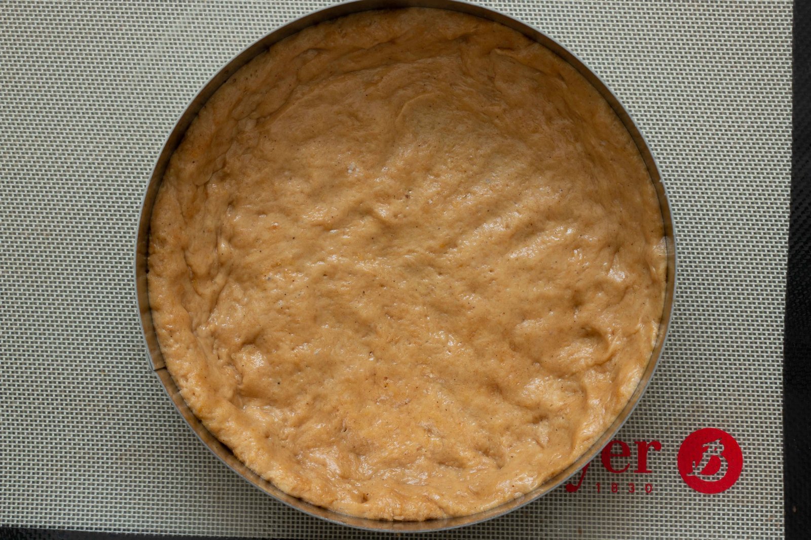 - Étalez votre pâte briochée dans un moule préalablement huilé. Un cercle à tarte est parfait pour démouler facilement votre tarte. Huilez légèrement vos mains si la pâte est un peu collante.